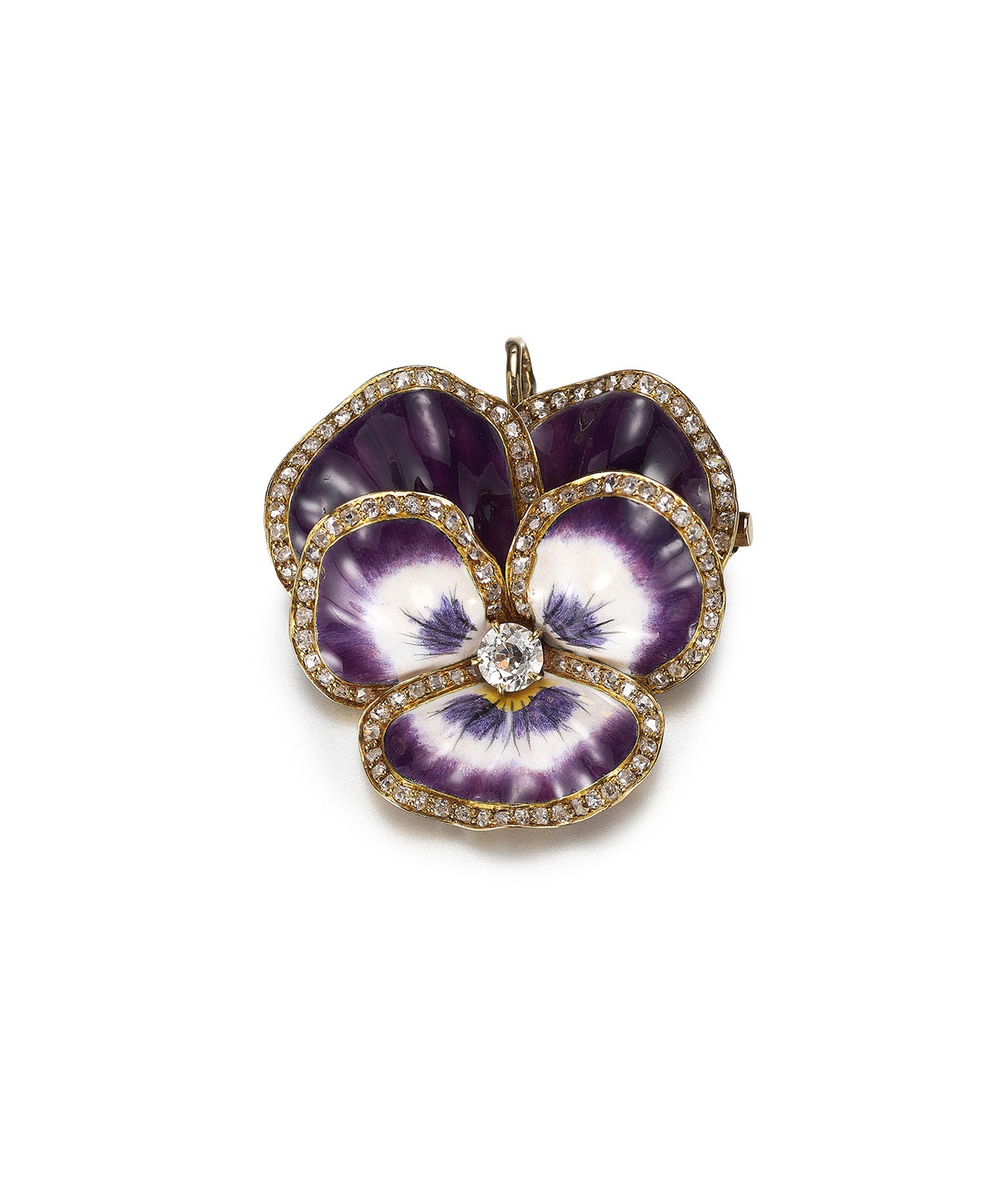 Modelled as a pansy, applied with enamel, set with a central circular-cut diamond, highlighted with smaller similarly-cut diamonds, measuring approximately 33 x 35mm, signed Tiffany & Co., French import mark for gold.