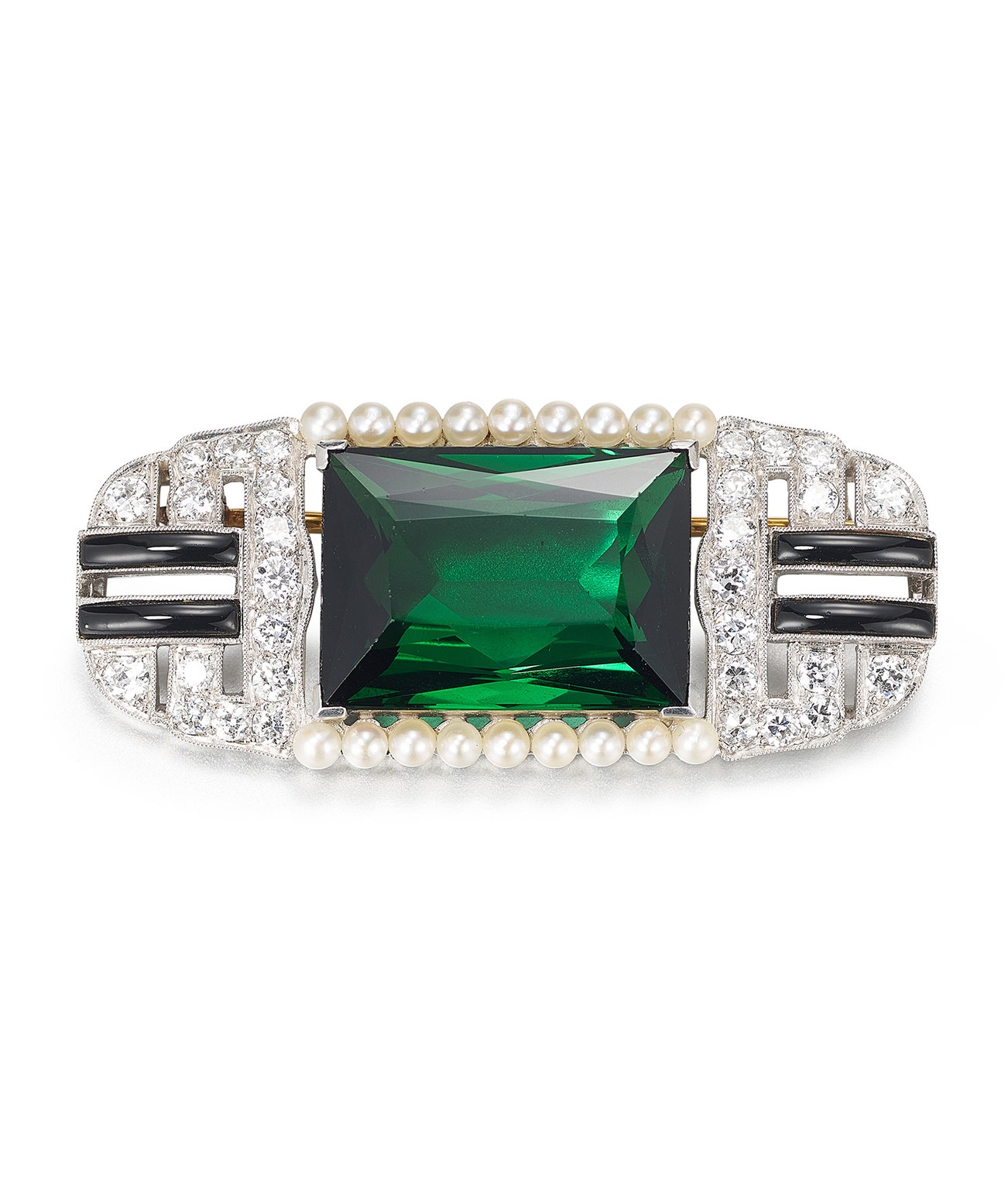 Tourmaline, diamond, pearl and enamel brooch, circa 1925