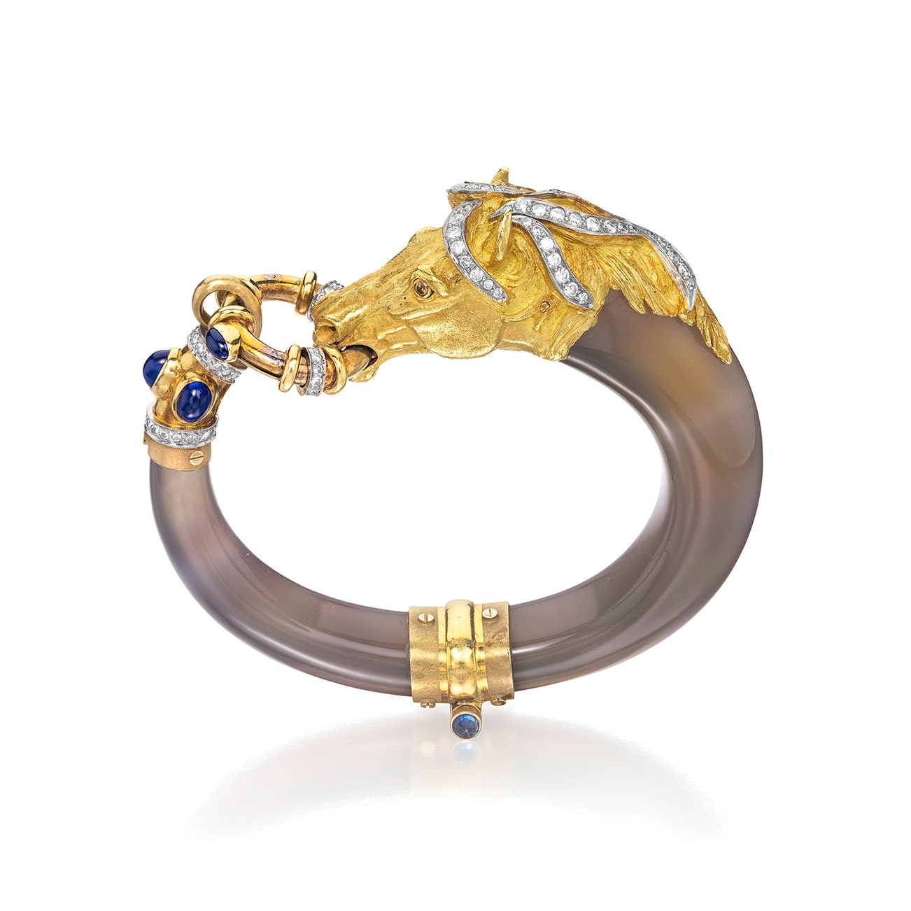 Of equestrian design, set with carved chalcedony, accented by brilliant-cut diamonds, decorated with circular-cut sapphires and oval-shaped sapphire cabochons, mounted in 18K gold, inner circumference approximately 6 1/4 inches, signed Tiffany & Co. 1995.