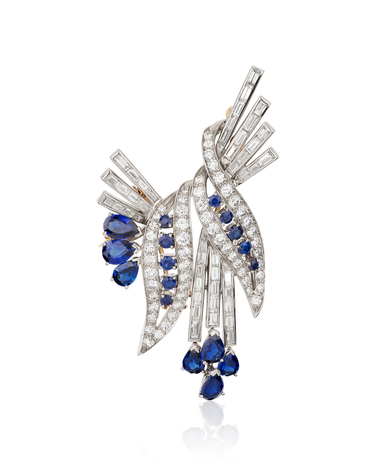 Set with pear-shaped and circular-cut sapphires, accented with brilliant-cut and baguette diamonds, measuring approximately 62 x 31mm, signed Tiffany & Co., case stamped Tiffany & Co, may be worn as two brooches.
