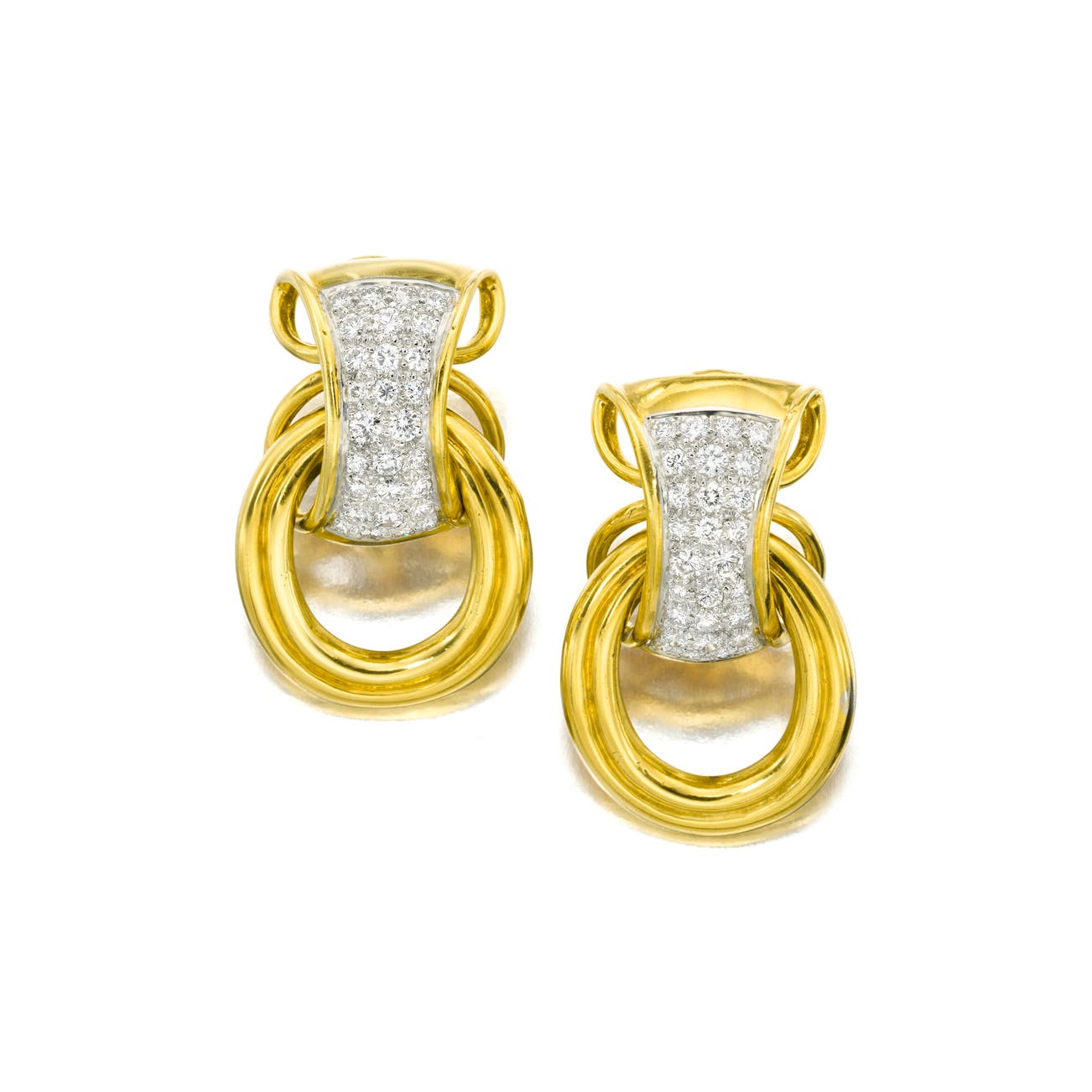 Of hoop design, each surmount embellished with brilliant-cut diamonds, mounted in 18k yellow gold, each signed Tiffany, length approximately 1 1/3 inches.