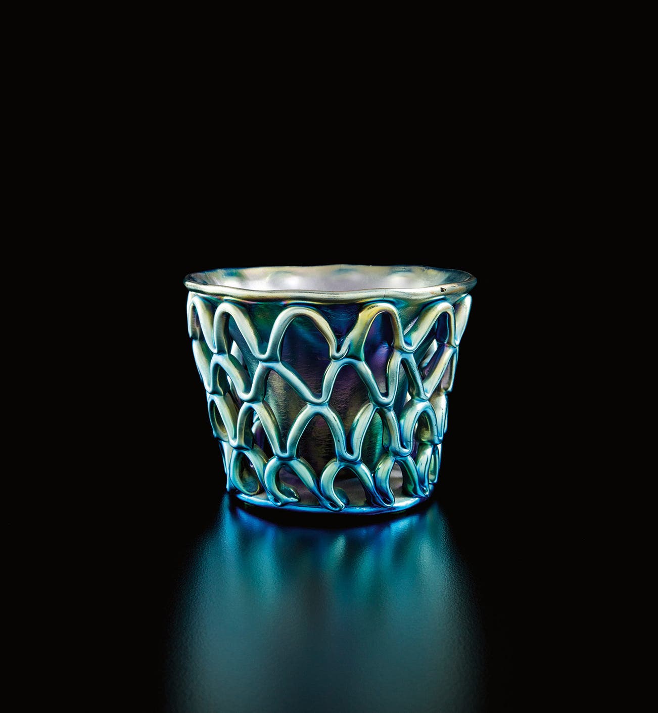 Louis Comfort Tiffany’s career as an artist, designer, and businessman is perhaps best summarized as an exploration of beauty through innovation and relentless experimentation. These four works from the Fromer Collection speak to the diversity of approaches to design that Tiffany Studios took at the beginning of the twentieth century. The Diatreta vase (lot 143) is an example of Tiffany’s groundbreaking invention of Favrile glass, the term that he used for his iridescent glassware. Diatreta refers to the cup’s form, which originates from Ancient Roman glassmaking traditions in which the lace-like exterior of the vessel is detached from the inner beaker form. Later, Tiffany began exploring ceramic making with his lamp bases, such as lot 140, in which he imitated the appearance of metalsmithing techniques. Tiffany Studio’s later pottery was often monochromatic and relied on motifs from nature, as seen in the vase with seed pods (lot 142).