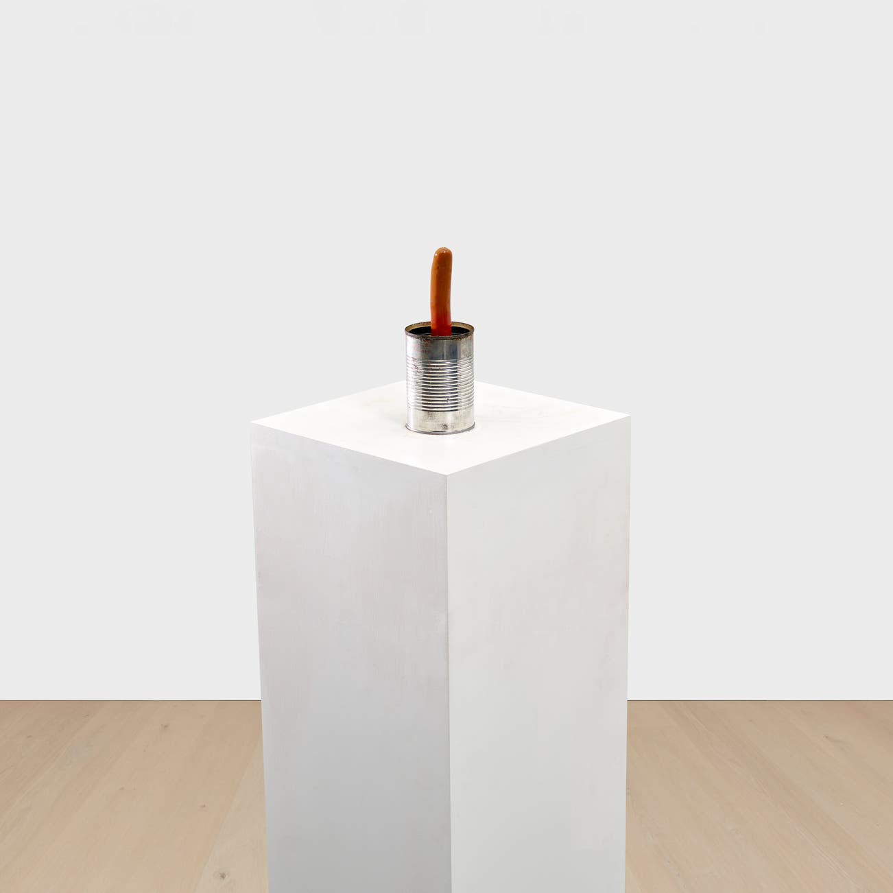 replica baked beans and sausage, tin can, plastic cap, electronic mechanism and MDF plinth