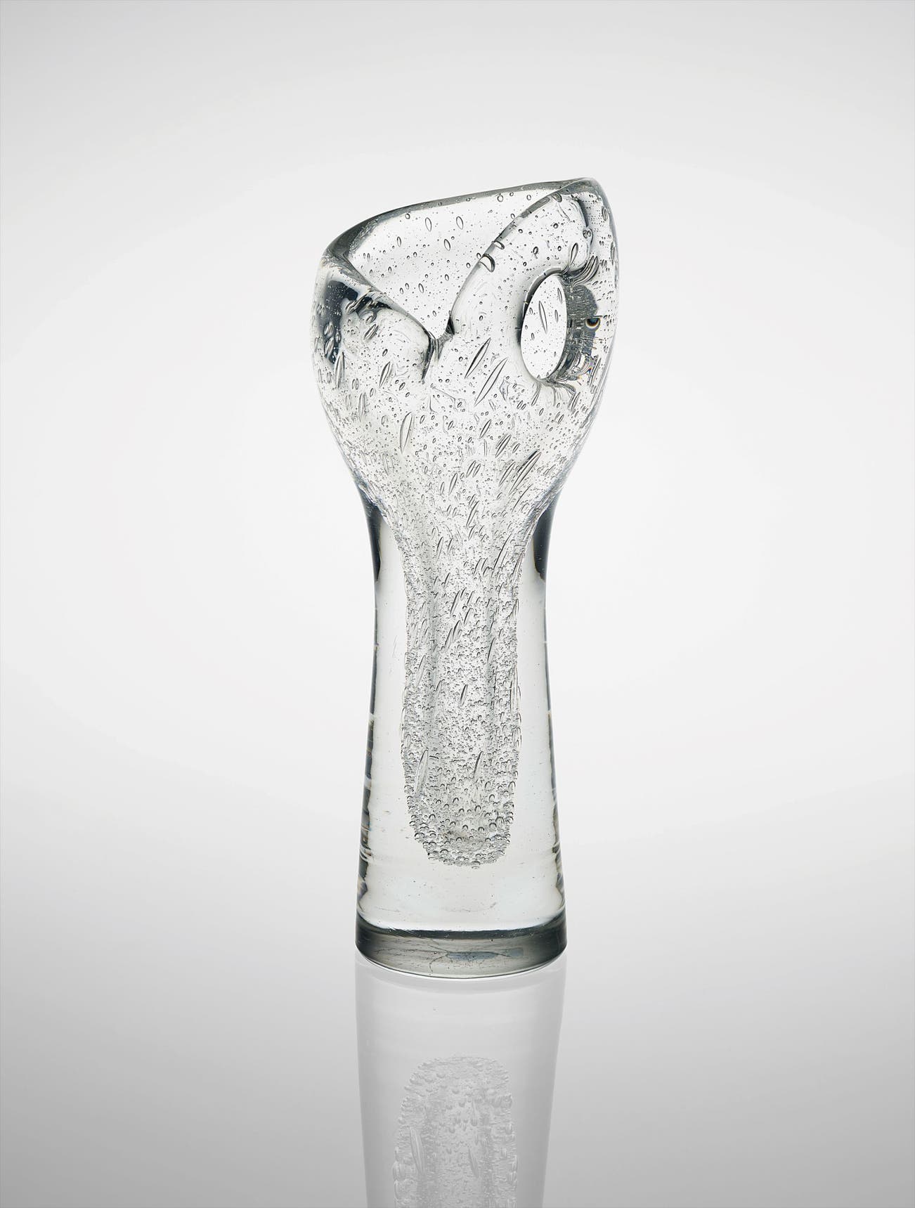 The 'Devil's Churn', not to be confused with the 'Devil's Fist', was produced using a very refined and sophisticated technique, encasing numerous air bubbles into the thick body of the vase. The rim of the vase is subsequently finished off-hand, the side pierced with shears and the base polished. The model was included in the Iittala production catalogue for eight years, between 1952 and 1960, but only a few examples are known to exist, one of which is part of the Bischofberger collection, Switzerland.