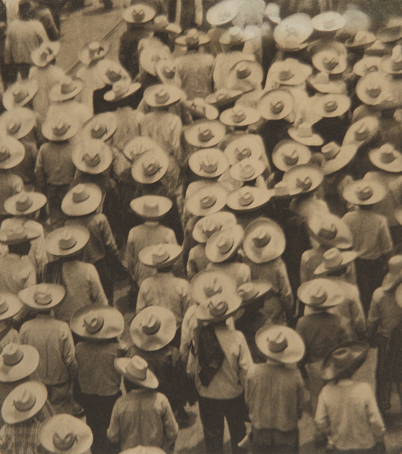 Tina Modotti’s involvement in the political conflicts of her adopted country was far stronger than that of Edward Weston, her lover and photographic mentor. While Weston’s fascination with Mexican culture was evident in his finely conceived studies of handcrafts and architecture, his chief interests were always in the formal concerns of photography. In contrast, Modotti had an abiding concern for the struggles of the Mexican working class, and many of her most powerful photographs reflect this. Nowhere do her formal and social concerns coalesce so successfully as in Campesinos, in which marching workers in a May Day parade are united with a composition of solidarity and strength.