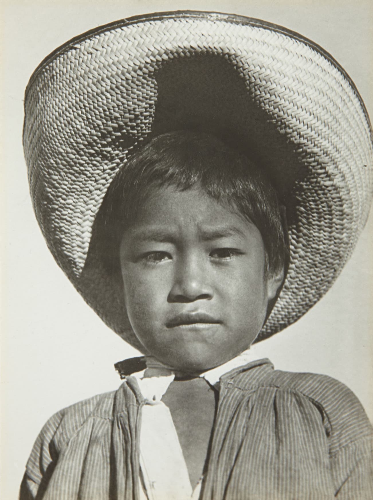 Modotti’s relation to the formal demands of modernism and the political experimentation of the 1920s is summarized in the current lot. Taken around the time she joined the Mexican Communist Party, the photograph shows a child wearing a sombrero. Modotti referred to him as “a proud little agrarista or son of one.” Agrarismo was a political and social movement that demanded the redistribution of land among peasants and the end of latifundismo, the concentration of land ownership among a few families. The plight of the little boy is thus that of humanity, his serious gaze and wrinkled forehead a symbol for the suffering of the destitute. Weston’s influence is apparent in the sombrero, which on its own becomes an abstract form, much like a shell or a pepper. Finally, the strong light that creates the contrast between the