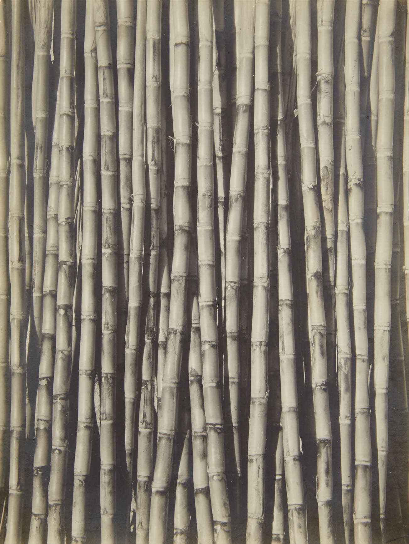 Sugar Cane is a rare print created made by Modotti while she lived and worked in Mexico (1923 -1930). While her earliest work in Mexico tended towards platinum prints of formally composed close-ups of flowers, still-lifes and uninhabited architectural spaces as well as portraits of the artists she associated with; by 1927, the year Modotti joined the Communist Party, her modernist aesthetic had become politically progressive. Around this time she also switched from the rich beauty of platinum prints to the tonal clarity of gelatin silver prints. One could assume that the gelatin silver print of Sugar Cane might fall into the earlier period with its tightly cropped and repeated vertical forms of the canes. But this seemingly purely formal image is also a political metaphor.