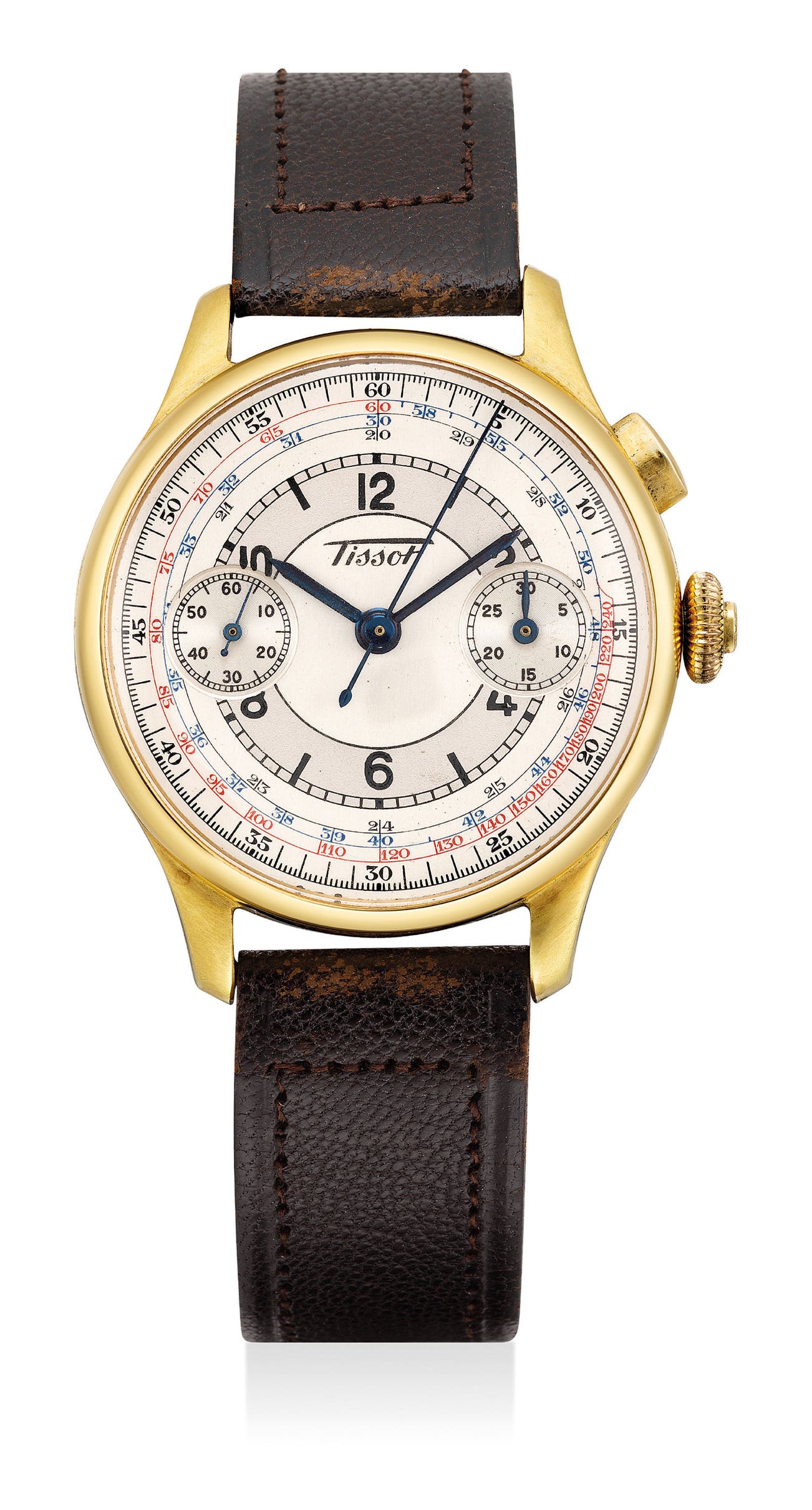 The present example of a Tissot chronograph from the 1940’s is an attractive example featuring a beautiful two-tone dial with blue and red accents.