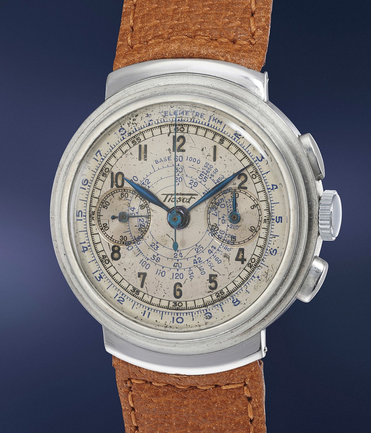 The present Tissot chronograph with its stepped case, hooded lugs, olive pushers and multi-scale dial offers a great value proposition for the new collector interested in starting a collection or the savvy collector wishing to add a timepiece from a well known brand and an unusual design to his or her collection.