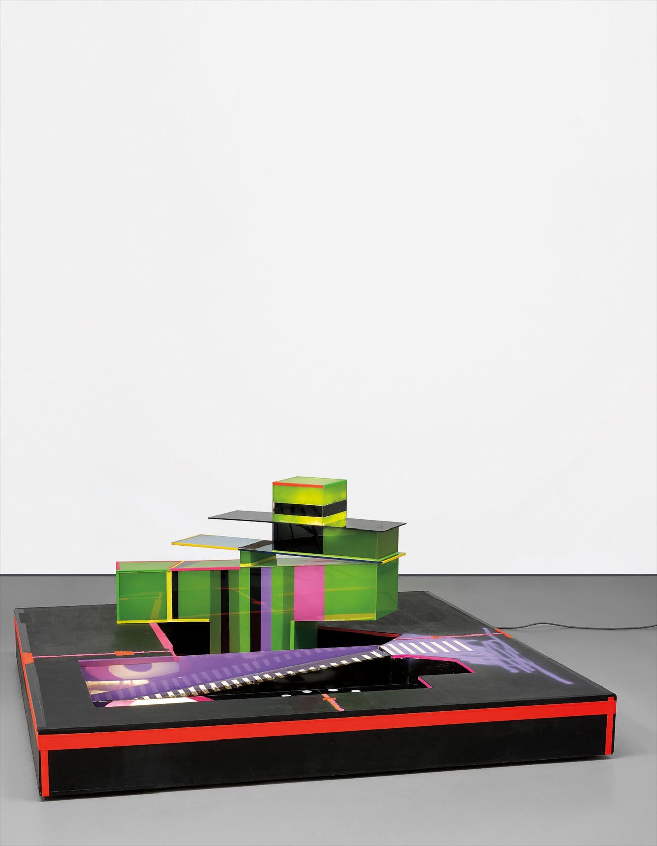 wood, acrylic paint, adhesive, plexiglass, neon