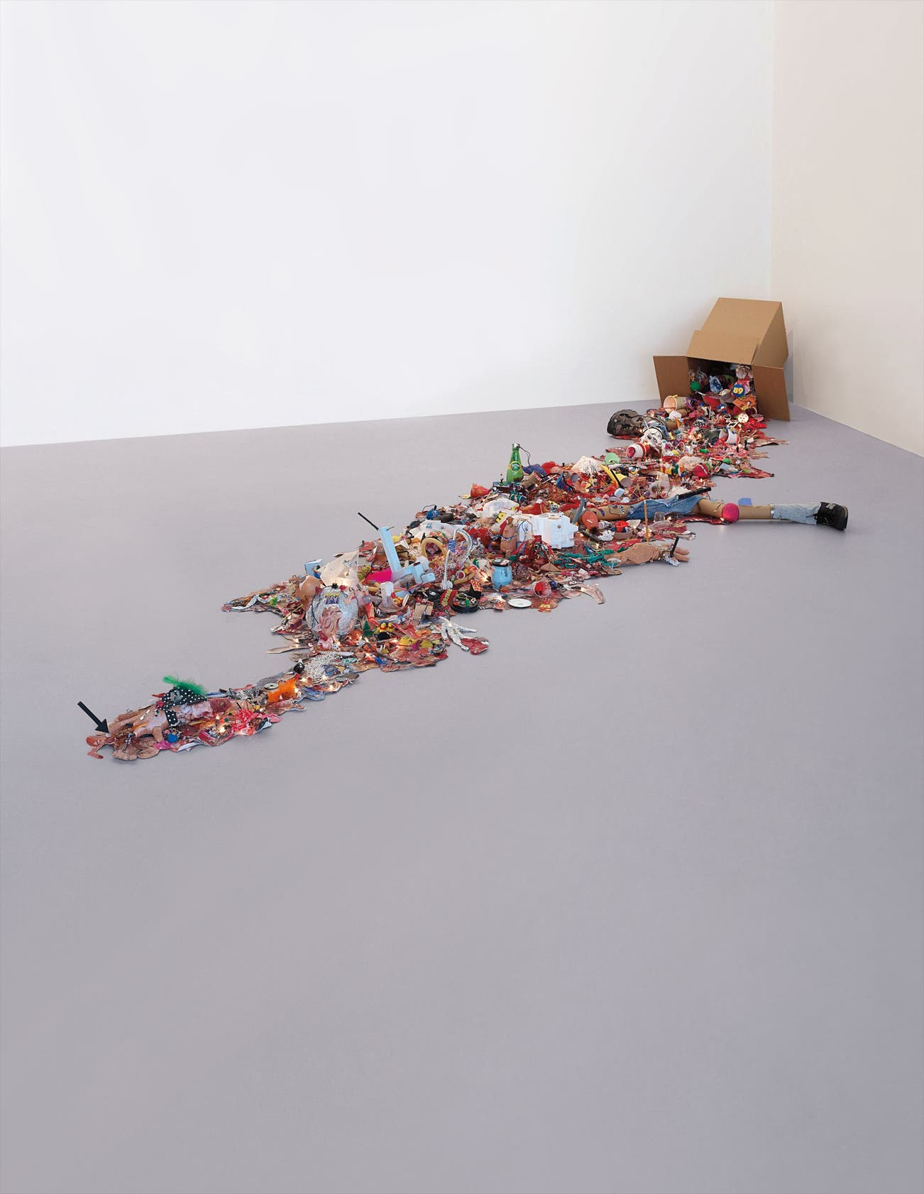 In the present lot, Inside Out, (1991-2006), Friedman repurposes a cornucopia of colorful and unusual everyday objects, amalgamating them into an amorphous body sprawled across the gallery floor, unfurled and undone for the world to witness. The use of the legs and arms extending into broad hands enforces corporeal structure upon this work and imbues what at first blush appears to be the chaotic spillage of a cardboard box’s contents with deeper meaning. That it is physically impossible for the tipped box to harbor its supposed contents on account of its inferior size is intentionally obvious. This dichotomy between exterior shell vis-à-vis the innards it houses is further emphasized by the smooth surface and even, monotonous, color of cardboard skin in stark contrast to the naked exposure of its hallucinogenic contents – an unabashed and spontaneous explosion of color, texture, and form. This disjunctive relationship both highlights and betrays the fundamental relationship between body and mind. Try as we may to compartmentalize our lives, aesthetically and superficially presenting ourselves as a creature of composure, our raw nature, and more ephemerally, our inner selves and souls are far too complex and unwieldy a beast to be so easily organized and self-contained.