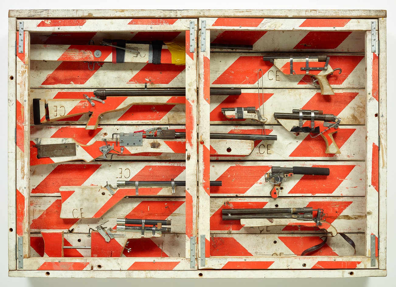 painted wood, metal, tape, plastic, leather and Plexiglas