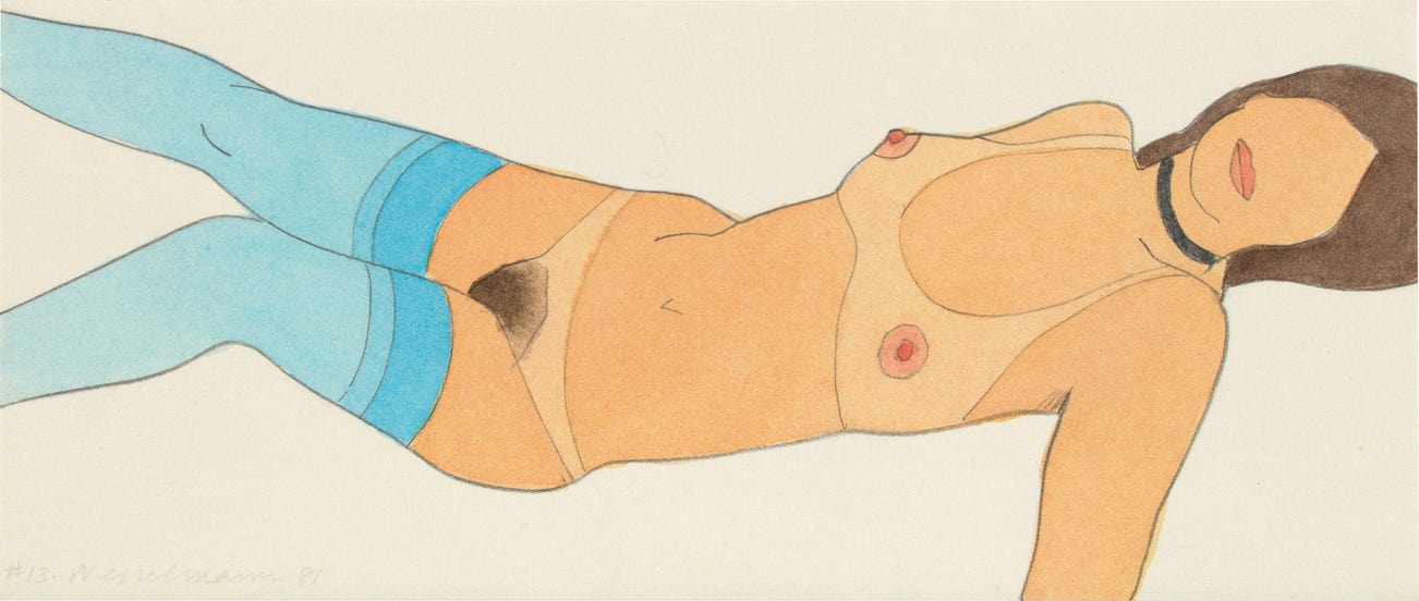 Wesselmann considered pop culture objects as exclusively visual elements and incorporated them in his works as pure containers of bold color. This color palette became the foundation for his now-iconic suggestive figurative canvases, often depicting reclining nudes or women's lips balancing a cigarette.