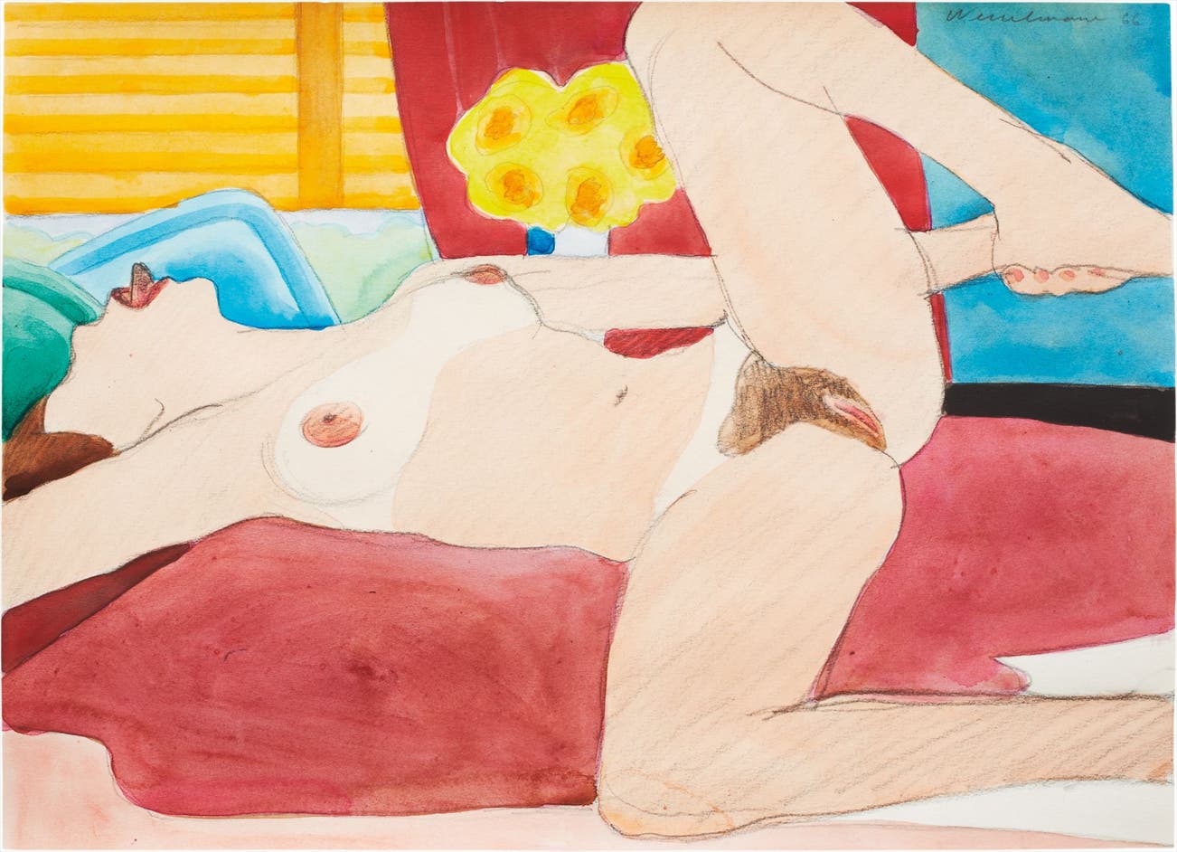 Wesselmann considered pop culture objects as exclusively visual elements and incorporated them in his works as pure containers of bold color. This color palette became the foundation for his now-iconic suggestive figurative canvases, often depicting reclining nudes or women's lips balancing a cigarette.
