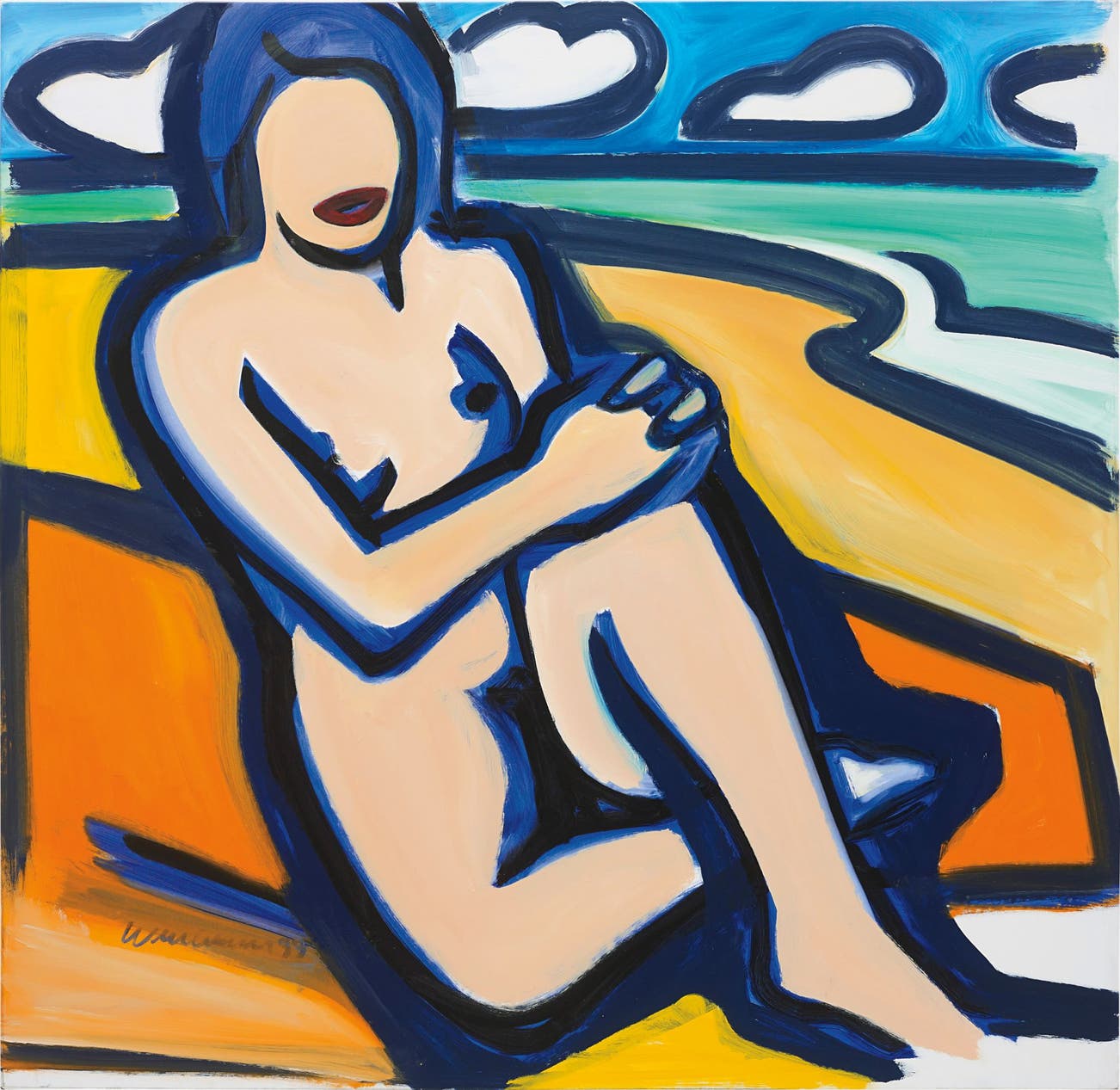 The present lot, Blue Nude Drawing (12/17/99), 1999 is a stunning work from Wesselmann’s late series of paintings referred to as “canvas drawings.” The series represents a more freehand approach for Wesselmann, who painted this work directly upon the canvas as if it were an enormous sketch pad rather than a pre-ordained canvas. The work is stylistically defined by the thick, bold brushstrokes which outline basic elements of the composition. The seated nude, with her hands folded upon her knee, seems to recline on a brightly colored orange towel, placed just so on a warm sandy beach. She is faceless with the exception of perfectly rendered and highly stylized dark red lips. Wesselmann comments on the absence of facial definition in these works, "From the very beginning I did not put faces on them, because I liked the painting to have a kind of action that would sweep through it, and certain things would slow that down: too much detail could slow it down. A face on the nude became like a personality and changed the whole feel of the work, made it more like a portrait nude and I didn't like that" (Tom Wesselmann in T. Buchsteiner, O. Letze, Tom Wesselmann, Ostfildern, 1996, p. 11) By intentionally leaving out the figure’s eyes, Wesselmann has in fact eliminated one of the most seductive, on other occasions confrontational, elements associated with the history of the female nude: the gaze. With no alluring return of the figure’s gaze back to the viewer, a strange sense of anonymity and remoteness prevails. The present lot thus balances abstraction and disembodiment with pop sensuality. The depicted figure’s folded form and her bold outline, executed in a heavy dark blue, are also reminiscent of Matisse’s blue nude cutouts of the early 1950’s. As the art historian Robert Rosenblum observed, “Much as Goya or Manet translated Renaissance Venuses into modern nudes who looked shockingly contemporary to the 19th century spectators, Wesselmann’s nudes bear the memories of this long tradition, while undermining its venerability by relocating these ancient sex goddesses in grassroots America.” (R. Rosenblum, “About Tom Wesselmann,” Tom Wesselmann, Nudes and Abstracts, exh. cat., Robert Miller Gallery, 2003)
