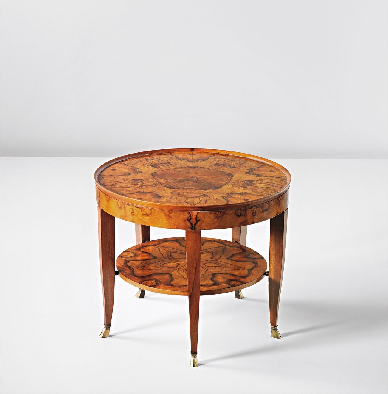 Burr walnut-veneered wood, walnut, brass.