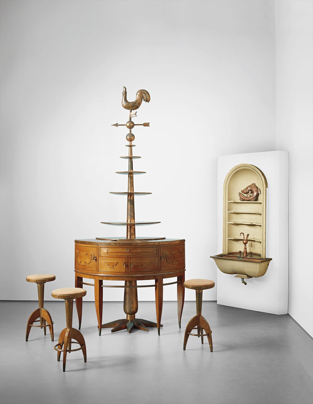 Unique and important cocktail bar with three stools and wall-mounted washbasin with niche, designed for the IV Triennale di Monza