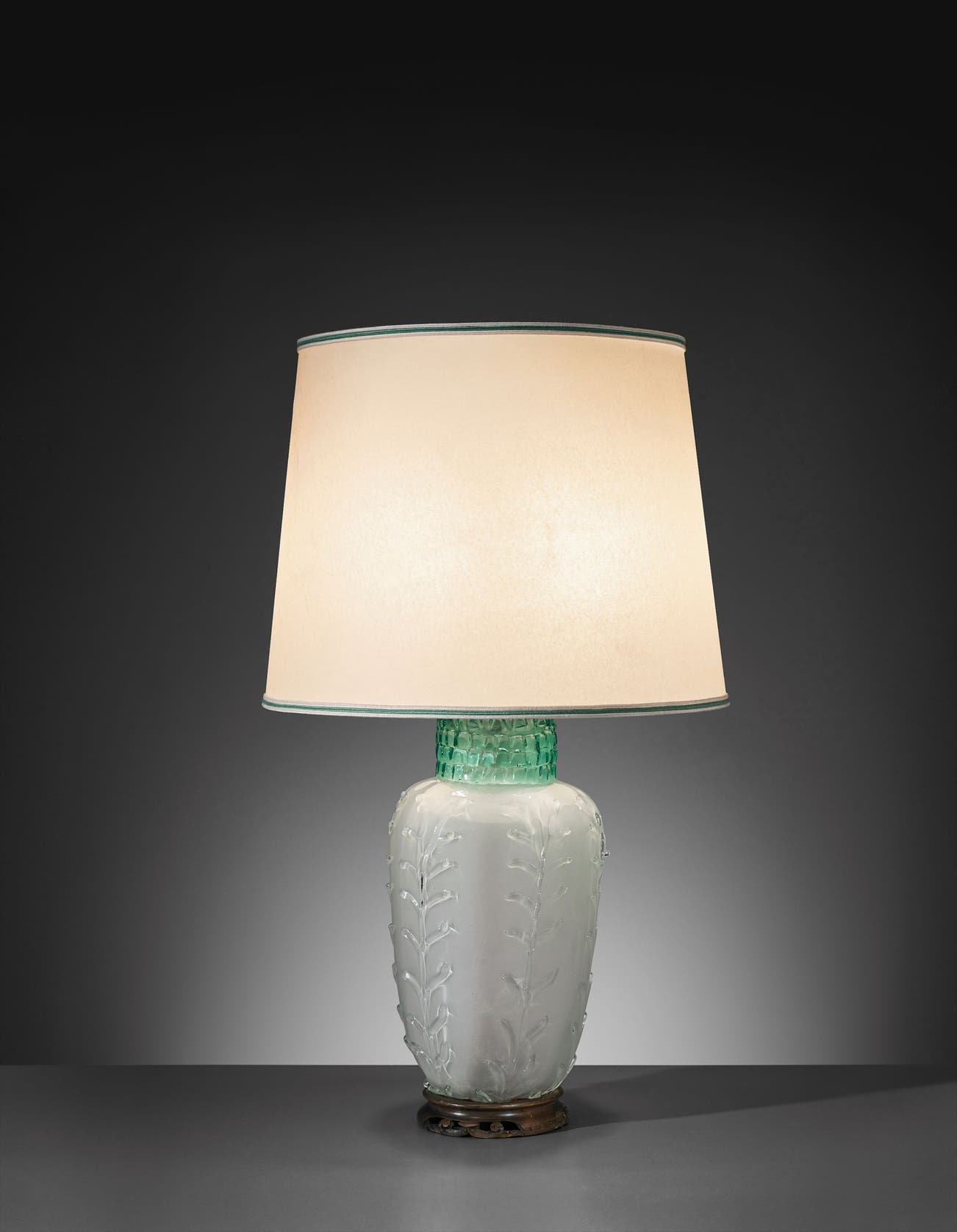 Opaque glass with foglie decoration, coloured verde giada glass, copper, stained walnut, aluminium, cellulose shade.