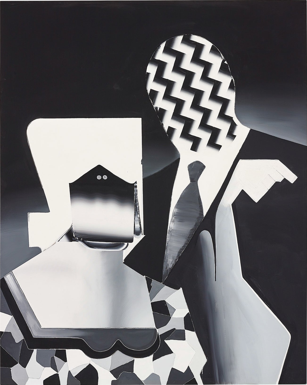Presenting Tomoo Gokita’s instantly-recognisable geometric forms in a striking grayscale palette, Sham Marriage, 2013, exudes the mystery and wit that have come to define the artist’s highly graphic oeuvre. Rendered with amalgamated zigzags and congruous angles, the painting delineates the anonymous silhouettes of a man and a woman over a subtle gradation of black and grey. Precisely achieved with acrylic gouache and charcoal on linen, the composition bathes in a textural complexity that is reflective of Gokita’s rigorous practice, whereby ‘there’s nothing haphazard — not even an accidental drip’ (Tomoo Gokita, quoted in ‘Tomoo Gokita’s painterly coup’, The Japan Times, 11 September 2014, online).