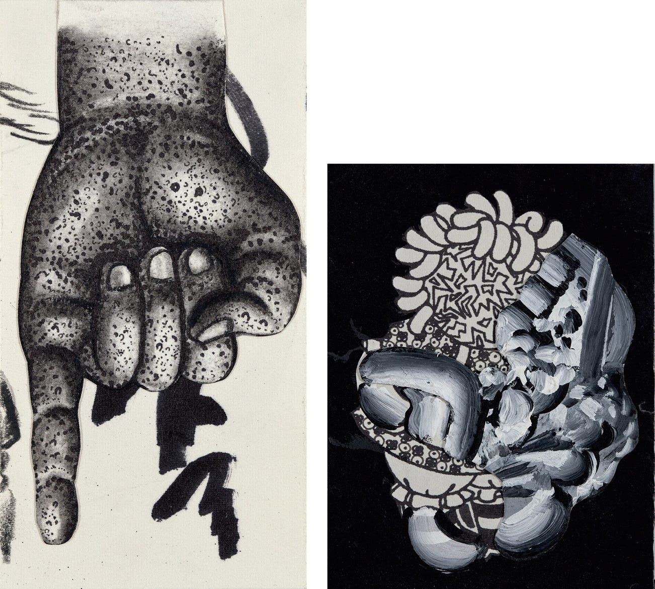 Two drawings with collage, one in black ink and one in white and black acrylic with black ink, on wove paper.