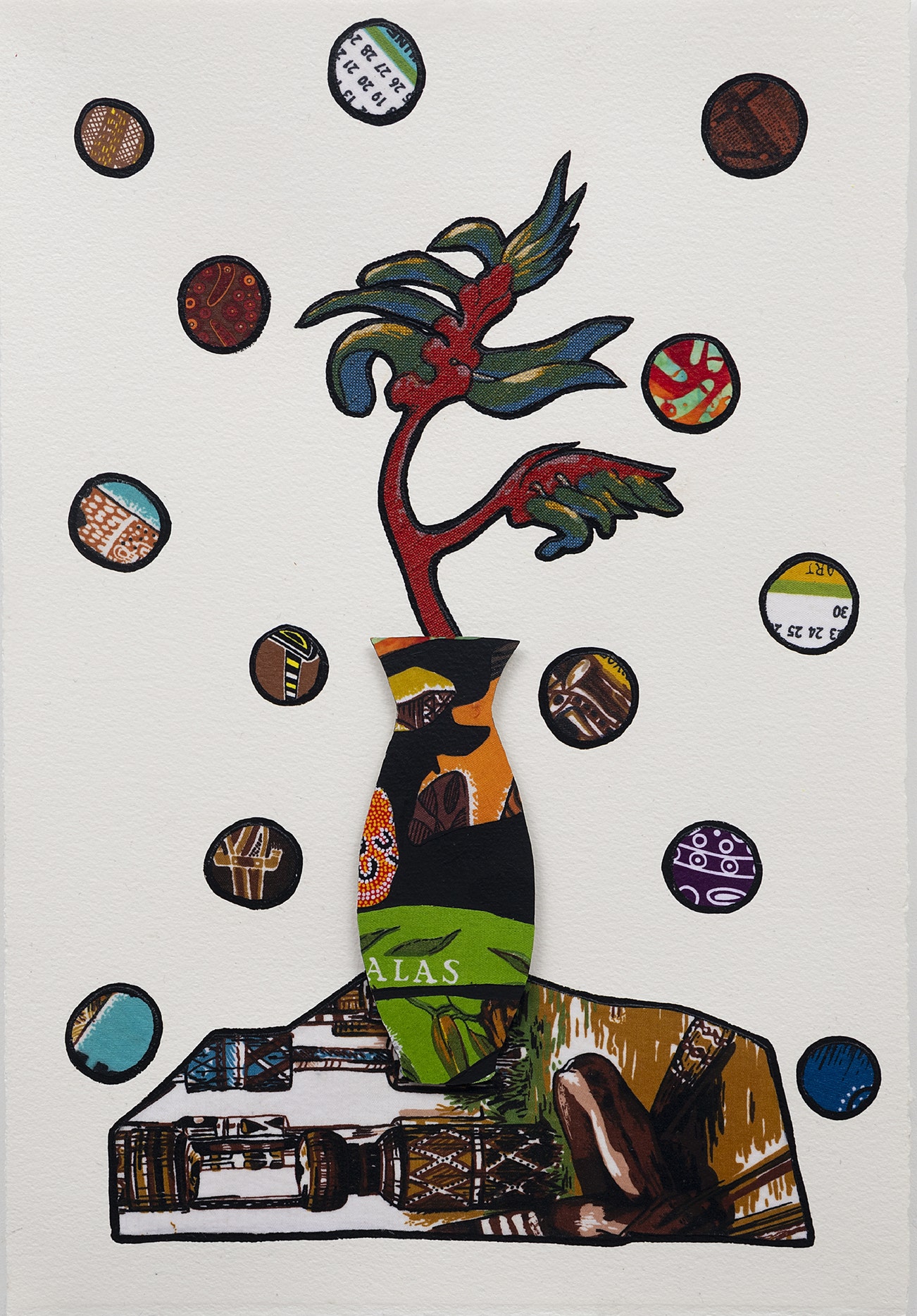 Remark (Modern Designer Vase #8) continues Tony Albert’s investigation into the imagery and identification of appropriated Indigenous Australian iconography in domestic decoration and design. It incorporates fabric from Albert’s personal collection of “Aboriginalia”—a term he coined to describe kitsch homewares and collectibles that inappropriately depict Aboriginal people and cultural material. As objects that were not made by Aboriginal people, these inauthentic images silence the voices and autonomy of Indigenous communities. Yet, they remain an important societal record that should not be forgotten.
