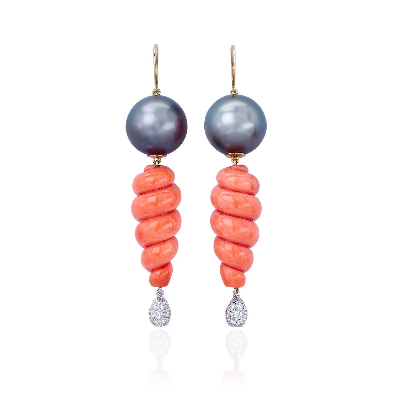 A Pair of Coral, Cultured Pearl, Diamond, and Gold Earrings