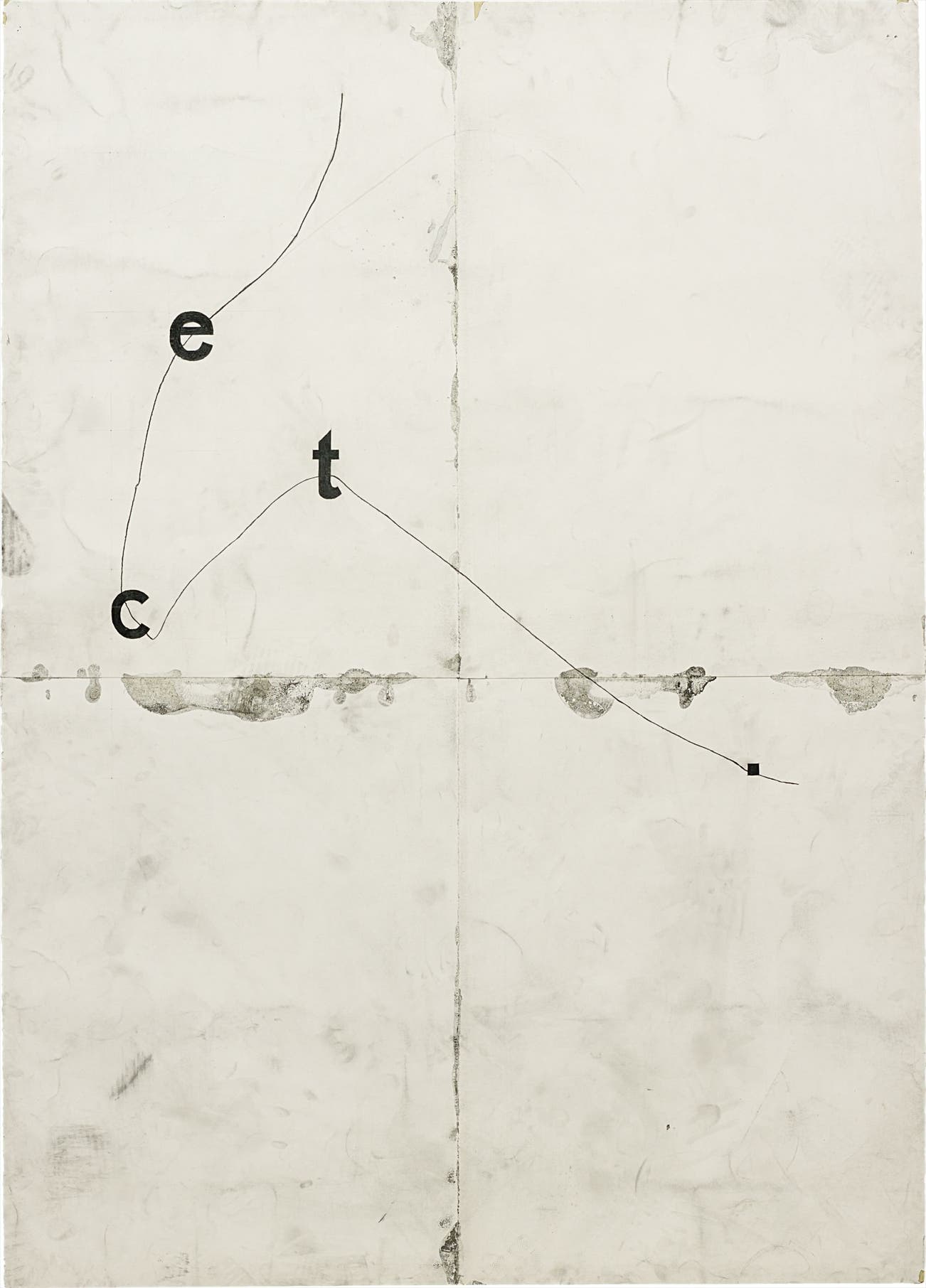 Tony Lewis’s text-oriented drawings, such as the superb etc. from 2012, hover between ghostly ethereality and grounded immediacy. Using some of the most basic and fundamental mark making tools, namely graphite and paper manifesting text, Lewis exercises an ability to critique his own particular language constructs into something that resembles a graphic poem – immediately recognizable as language but not as easily digested. He treats the paper in such a way as to result in it resembling something more akin to a found object than a worked artistic construct – a student’s scrap paper pulled from the bottom of a knapsack writ large. And yet, when the viewer sees that the group of text, here the letters “e” “t” and “c” are rendered in near perfect Arial font, the illusion of perfect automatism and abstraction is immediately destroyed. Rearranged and seemingly hung upon a string dangling across the canvas, each individual letter seems to be both a purely individual object and one connected to a greater whole, not dissimilarly from letters in a word; words in a sentence; sentences in a paragraph and so on – each a unique building block of the “bigger picture.” Lewis, however, doesn’t understand his language to behave in any finite and easily proscribed fashion like bricks in a wall. His “bigger picture” is panned out and blurry with no clear boundaries at all. For Lewis, language and text are much more fluid, distorted, mutable, and subjective, just as his own perception of his surrounds adapts and responds, engages and distances, without any definitive restrictions or embellishments. etc., is an excellent example of the manner in which Lewis brandishes text, here literally meaning “and the rest,” to address that which is both not present, hence unknown visually, but also understood as an implied piece of information.
