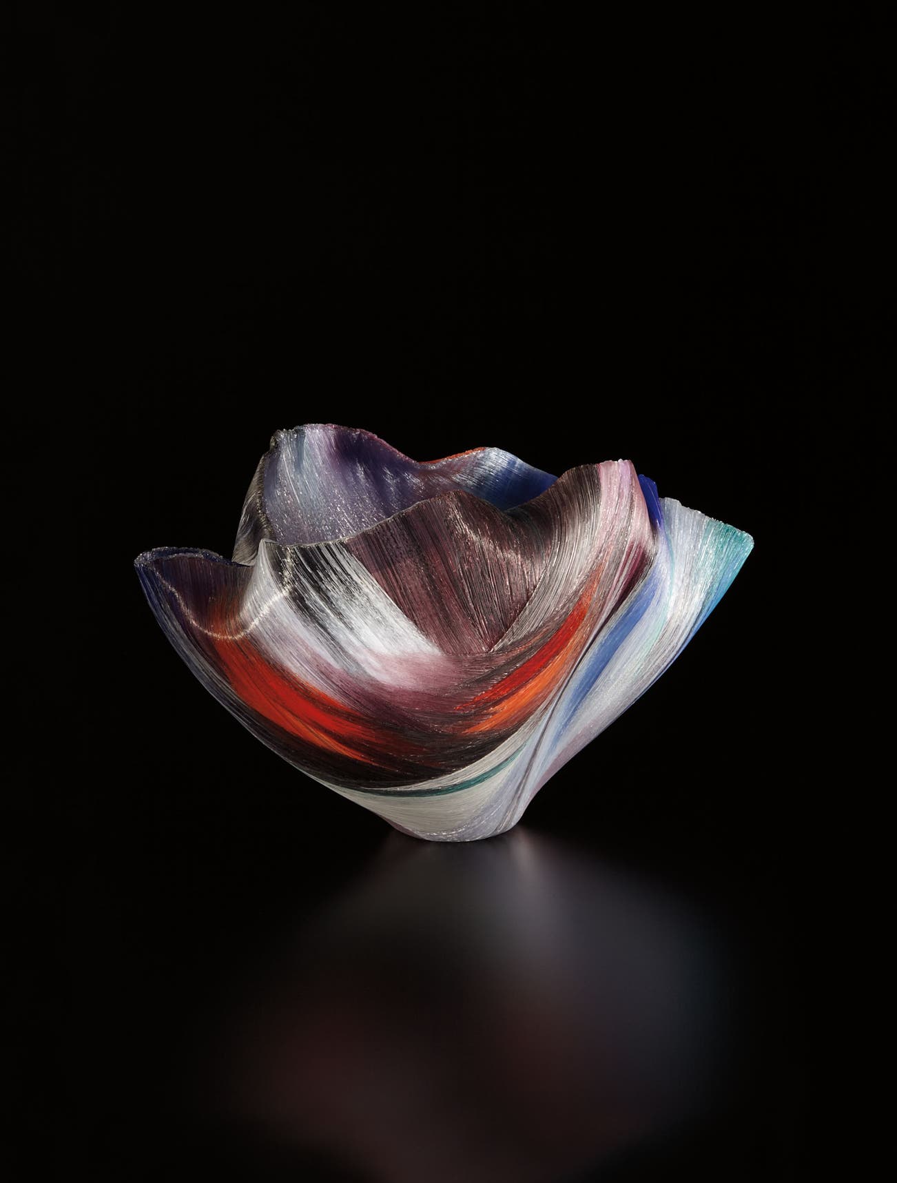 It was not until 1982 that Zynsky developed her signature filet de verre technique. Initially Zynsky made her glass threads in the traditional Venetian manner—“I had two teams of people pulling thread all afternoon for me,” she recalled. But soon an acquaintance, Mathijs Teunissen Van Manen, helped her build a machine for pulling glass thread, similar to the process of making glass optical fiber. A three week trip to Europe turned into 16 years, and Zynsky established a studio in Amsterdam where she continued to refine her technique. Her process involves “painting” with thousands of multicolored glass threads by layering them on a heat-resistant plate. The threads are then fused and slumped in the kiln, and finally, wearing heat-resistant gloves, she reaches into the kiln and shapes each piece into its final, undulating form.