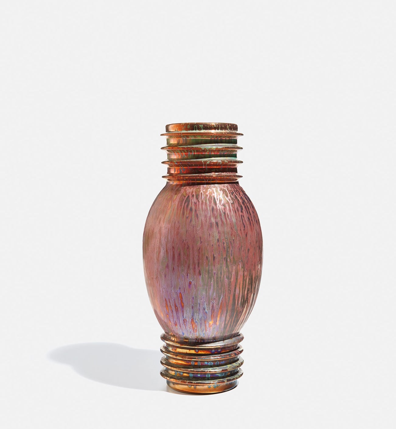 The first Futurist ceramics consisted of geometric and bright forms transposed onto traditional ceramic bodies. Eventually, though, the forms themselves became Futurist in nature, often taking on machine-like shapes. The present vase, for example—and as its name suggests—clearly takes inspiration from the shape of a turbine engine. Despite the fact that the vase was created by one of the leaders of the Futurist ceramic movement, the vase’s luminous glaze and its emphasis on the machine harken the Art Deco period and the Machine Age, respectively. It is this straddling of aesthetic and academic boundaries—whirling between styles yet simultaneously grounded within its historical context—that make this vase “mechanical, dazzling, luminous.”