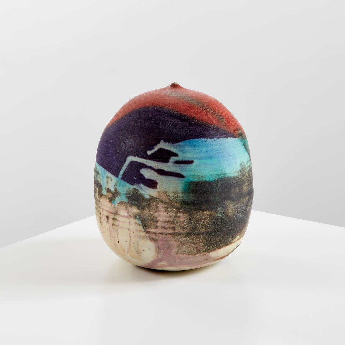 After this trip, Takaezu created her first closed form, whose rotund volume and tapered rim would become her signature structure. Takaezu hand-built and threw her closed forms, creating them in a wide range of proportions. She often glazed them in abstract, gestural strokes, selecting colors that invoked the landscape of her native Hawaii. The present lot comes from her Ocean Edge series, a body of work that explores the effects of glaze layering on porcelain, relying on rich turquoise and cranberry red pigments. Seeking to activate the auditory senses, Takaezu sometimes placed clay beads into the closed forms, allowing them to gently rattle.
