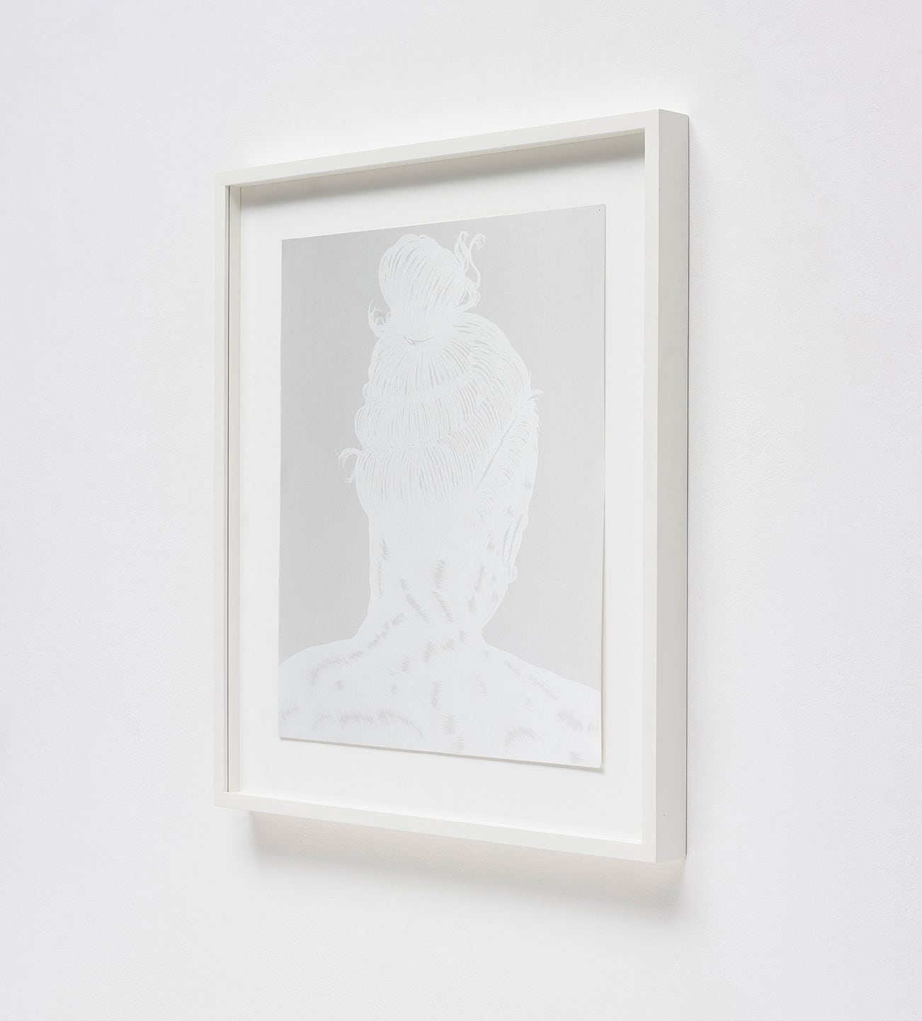In They, executed in 2015, Toyin Ojih Odutola expands her progressive examination of the human form by toying with tonal variations and subtle delineation in her paired-back palette. Exquisitely executed in white charcoal on paper, the sitter’s back and hair emerges from the white ground as the viewer moves around the work. With the onlooker’s moving perspective, the light and dark areas shift and alter, unveiling the contours of the central figure. The work beautifully exemplifies the artist’s distinct exploration of skin and hair and showcases her mastery of mark-marking. Imbuing her unnamed subjects with an energetic vitality, the forms of her unknown sitters are layered through a stratum of charcoal strokes, showcasing her blocks of shading and adept use of materials. Included in Ojih Odutola’s solo exhibition Of Context and Without at Jack Shainman Gallery in 2015 to 2016, the artist’s work has been celebrated internationally and most notably at her first solo museum exhibition, To Wander Determined, at the Whitney Museum of American Art in 2017.