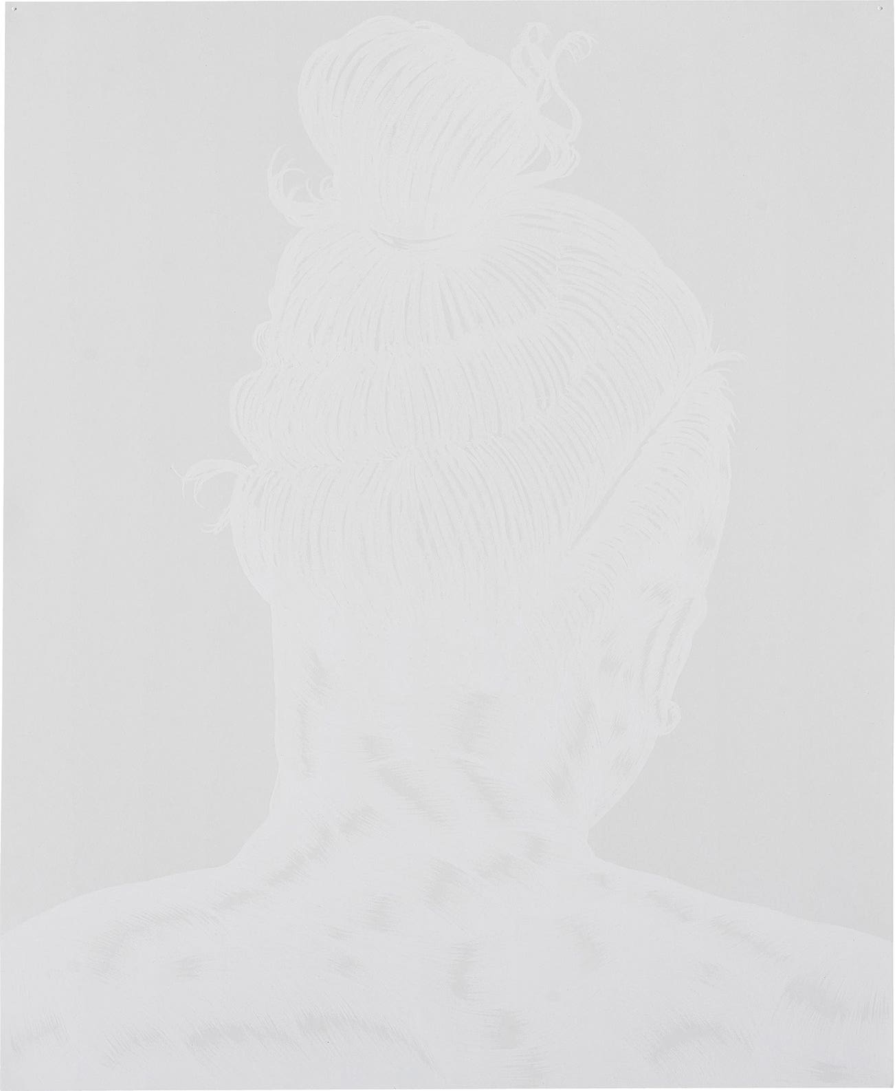 In They, executed in 2015, Toyin Ojih Odutola expands her progressive examination of the human form by toying with tonal variations and subtle delineation in her paired-back palette. Exquisitely executed in white charcoal on paper, the sitter’s back and hair emerges from the white ground as the viewer moves around the work. With the onlooker’s moving perspective, the light and dark areas shift and alter, unveiling the contours of the central figure. The work beautifully exemplifies the artist’s distinct exploration of skin and hair and showcases her mastery of mark-marking. Imbuing her unnamed subjects with an energetic vitality, the forms of her unknown sitters are layered through a stratum of charcoal strokes, showcasing her blocks of shading and adept use of materials. Included in Ojih Odutola’s solo exhibition Of Context and Without at Jack Shainman Gallery in 2015 to 2016, the artist’s work has been celebrated internationally and most notably at her first solo museum exhibition, To Wander Determined, at the Whitney Museum of American Art in 2017.