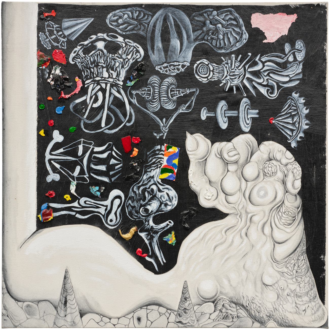 Hancock's complex mythological battles at once recall biblical stories that the artist learned as a child from his family and local church community, comic-strip superhero battles, and medieval morality plays – all conveyed through a visual language that merges disparate influences such as pulp fiction, comic books, abstract painting with references to forebears as varied as Hieronymus Bosch, Max Ernst, and Philip Guston.