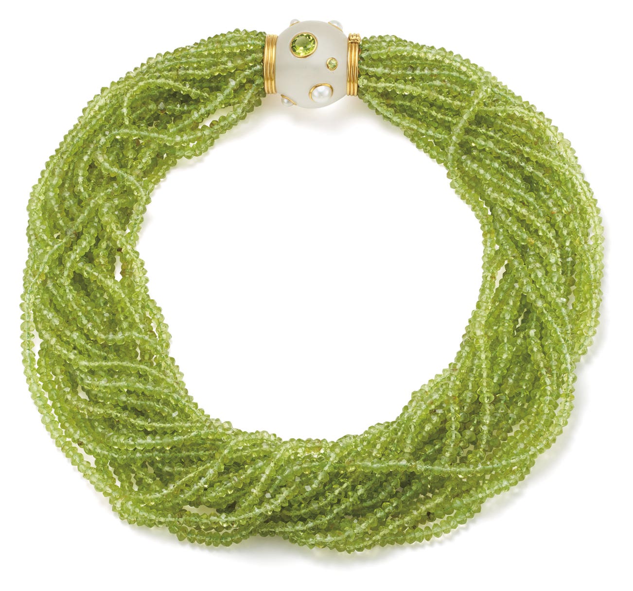 A Multi-Strand Peridot, Mabé Pearl, Rock Crystal and Gold Torsade Necklace