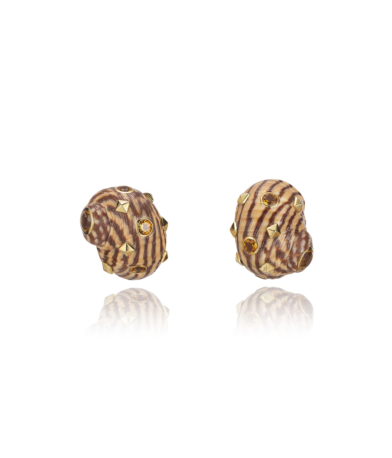 The turbo shells each set with a central circular-cut citrine, highlighted with smaller similarly-cut citrines and gold accents, measuring approximately 28 x 18mm, signed Trianon, numbered.