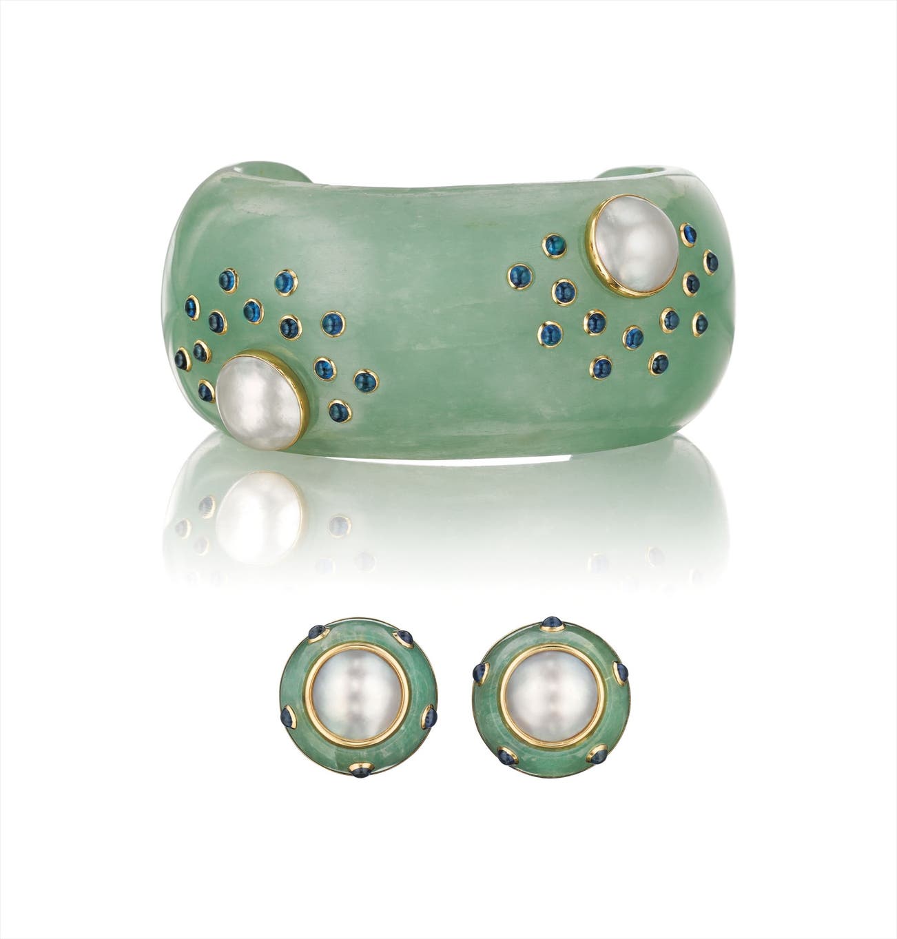 Comprising a wide jade cuff, accented by mabé pearls and cabochon sapphires within a polished gold surround; a pair of similarly designed earclips en suite, mounted in 14K yellow gold, bracelet diameter 2 inches, earclips length 3/4 inches.