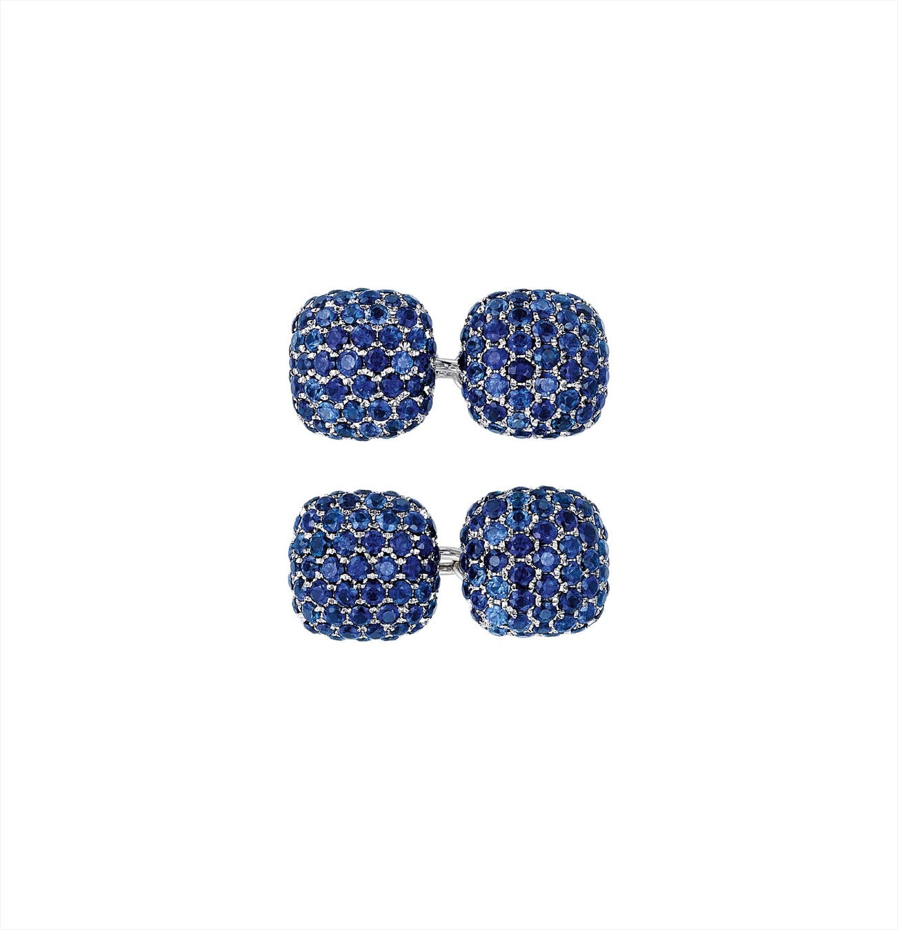 Each designed as a square bombé plaque set entirely with pavé-set sapphires, to the similarly designed link, mounted in 18K white gold, length 1/2 inch.