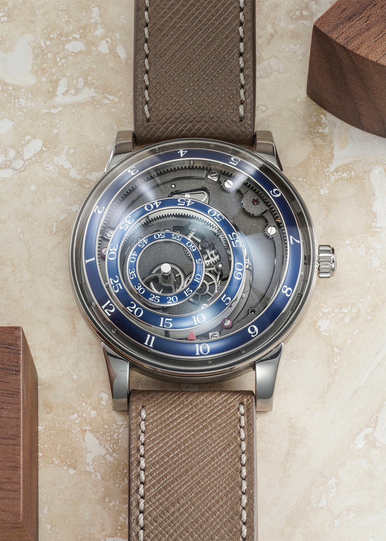 - Featuring the hours on the periphery, then the minutes and finally, in the centre, the seconds, the Trilobe uses a traditional 40mm diameter case, offered in grade 5 titanium. Its intricate ring-system, is made possible thanks to the partnership with well-known watchmaker Le Cercle des Horlogers, based in La Chaux-de-Fonds. The partnership led to the creation of the X-Centric caliber, offering 48 hours of power reserve the plates are micro-blasted and electro-plated for a matte, dark finish. Visible thanks to the absence of a "conventional" dial, the grain finish of the main-plate completes the modern look.