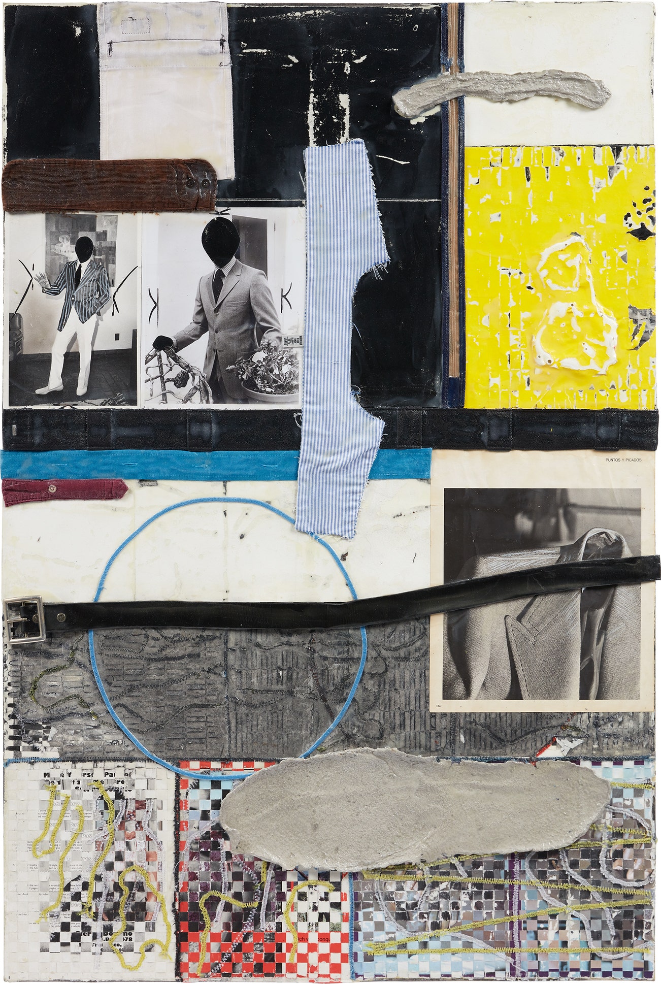 cut paper, photographs, polyester thread, papier-mâché, leather belt, cut clothing, tape, graphite, ink, grease pencil, acrylic and woven paper on stretched linen
