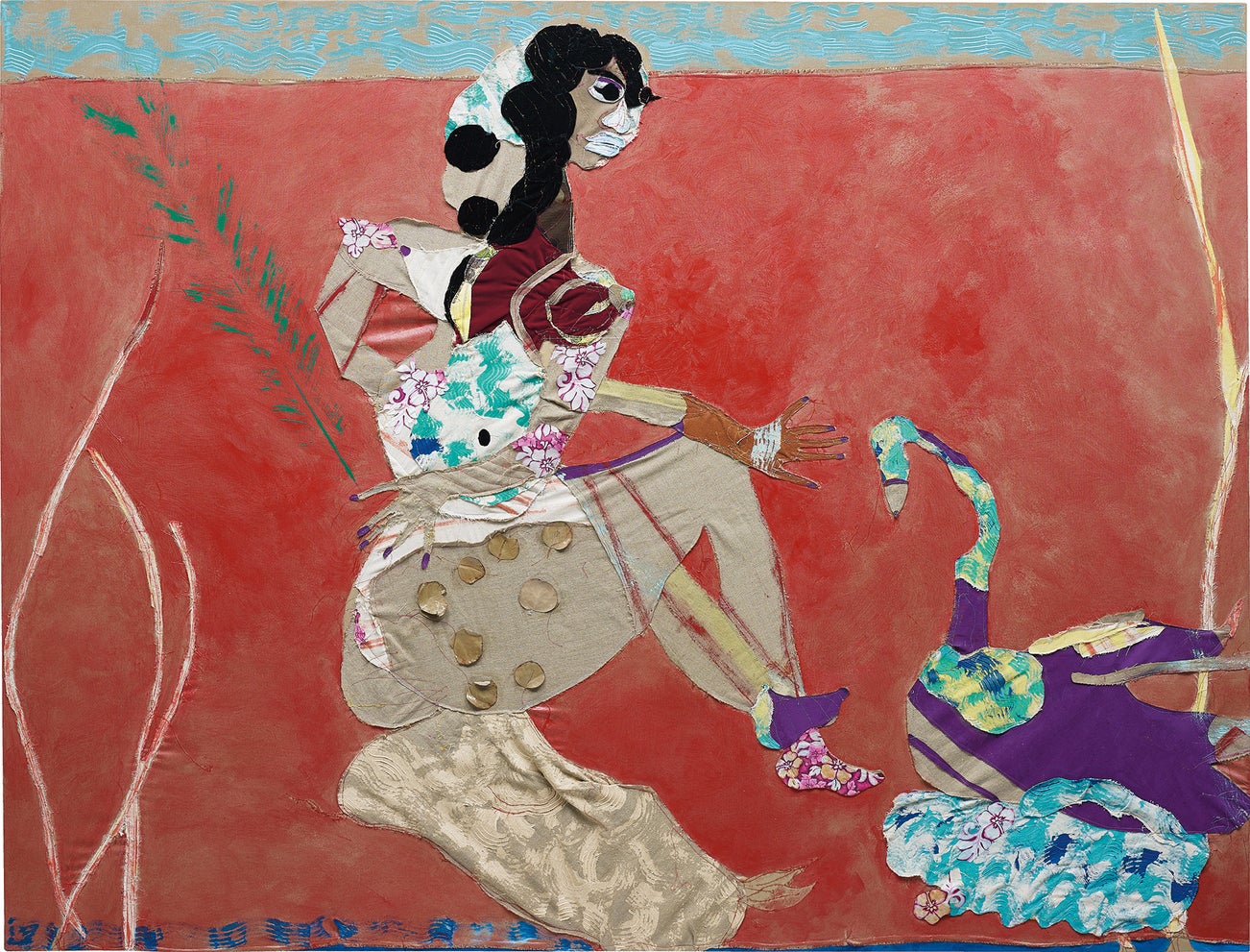 Challenging collective fantasies surrounding the black female body, Tschabalala Self’s artistic practice revolves around the seminal events and scenes that have punctuated history, mythology, and biblical narratives with strong female characters. In Leda, 2015, the artist reimagines the story of the eponymous Aetolian princess who, prior to becoming a Spartan queen, was seduced by Zeus in the guise of a swan. The canvas transforms into a dreamscape of unique visual codes: presenting the iconic scene in various colours, patterns and materials, it portrays the two protagonists in a polyvalent and experimental manner that is typical of Self’s creative process, developed during her MFA at Yale University, 2013-2015. With its multifarious adornments and textures, the composition exudes a tangible energy that matches the narrative content laid atop its surface; blown up to immense dimensions and set against an arresting carmine backdrop, it bears a sense of grandeur that only heightens the scene’s gravitas. First exhibited in the year of its execution at The Cabin in Los Angeles, Leda was subsequently shown at the Museum of Contemporary African Disaporan Arts in New York in 2016.