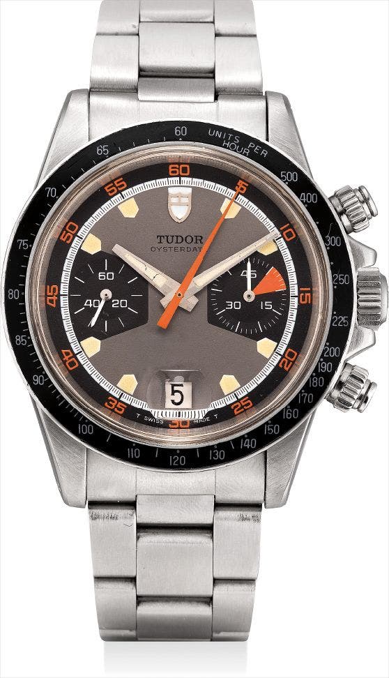 The present watch is a very original example with strong case definition. This Tudor Oysterdate Chronograph features a 40 mm. case and a 14 mm. thickness, screw down pushers with milled design and its so-called 'Monte Carlo-type' dial, a nickname given as the dial represents the casino chips. The dial is also referred as a 'home-plate' dial due to the dial design resembling a home plate in baseball.
