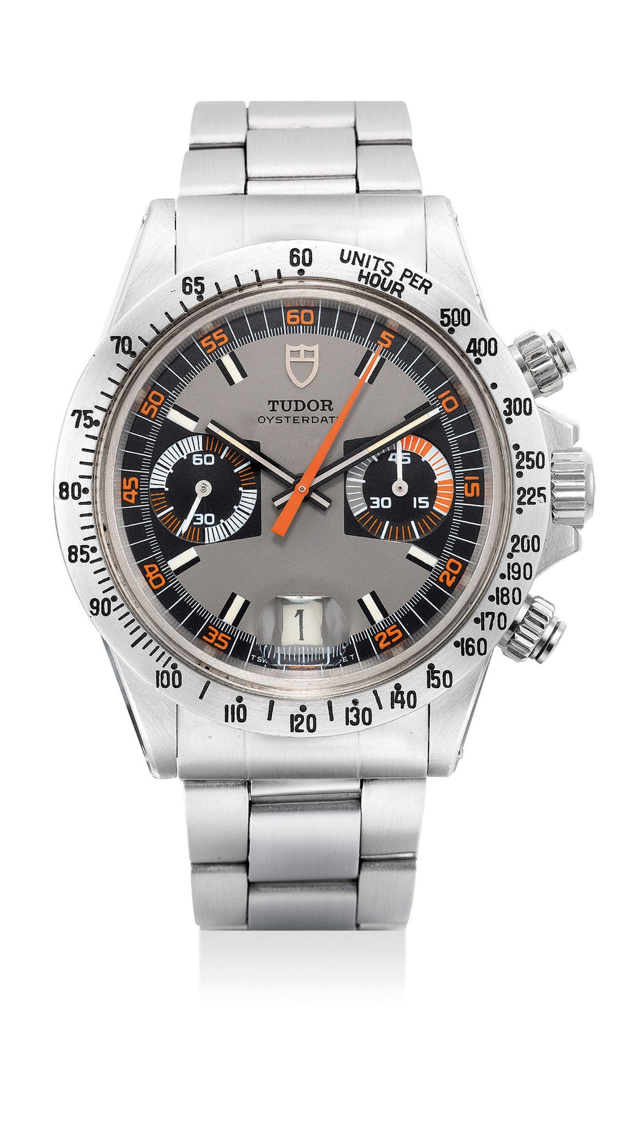 The present example fitted with a grey dial with orange, black and white accents is presented in excellent overall condition with its straight lugs well retained and crisp featuring a clean and attractive dial.