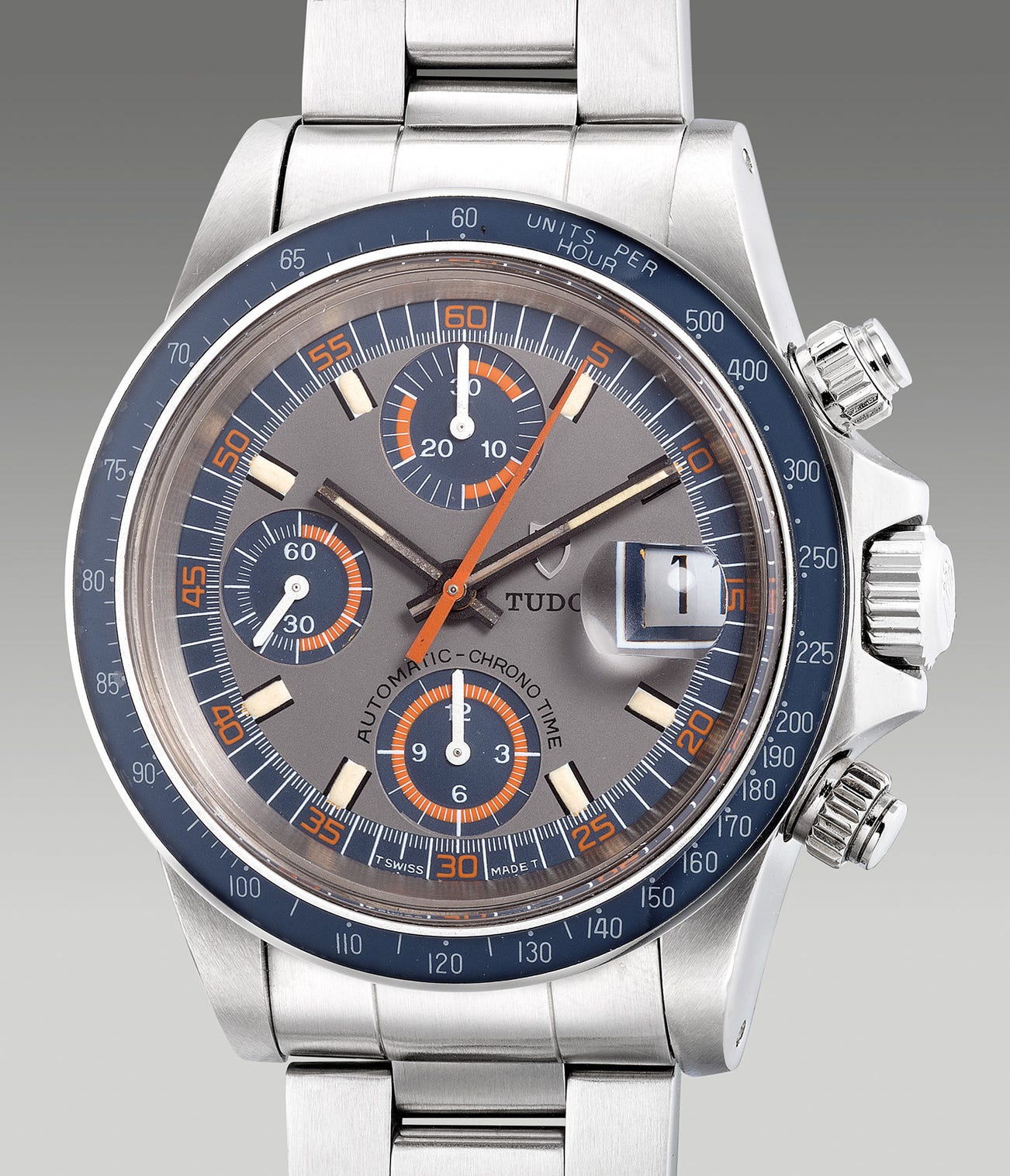 The present example “Big Block” preserved in attractive overall condition with a refreshing grey dial with blue and orange accents is without a doubt a desirable tool watch. It is further accompanied by the original presentation box as well as the original caseback sticker.