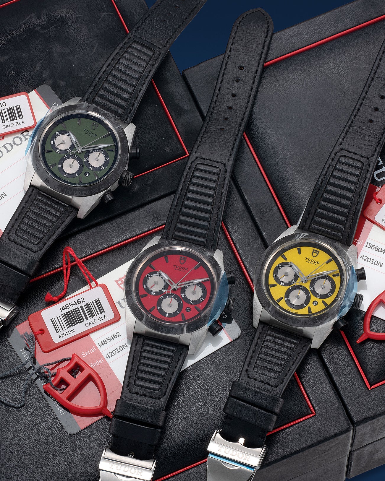 The present complete set of Tudor Fastrider chronographs in all three colors remains in its original factory sticker and are never worn. It is further accompanied by its full set of accessories making this “new-old-stock” set bang for the buck and are the perfect chronographs on rotation to match your for daily wardrobe.