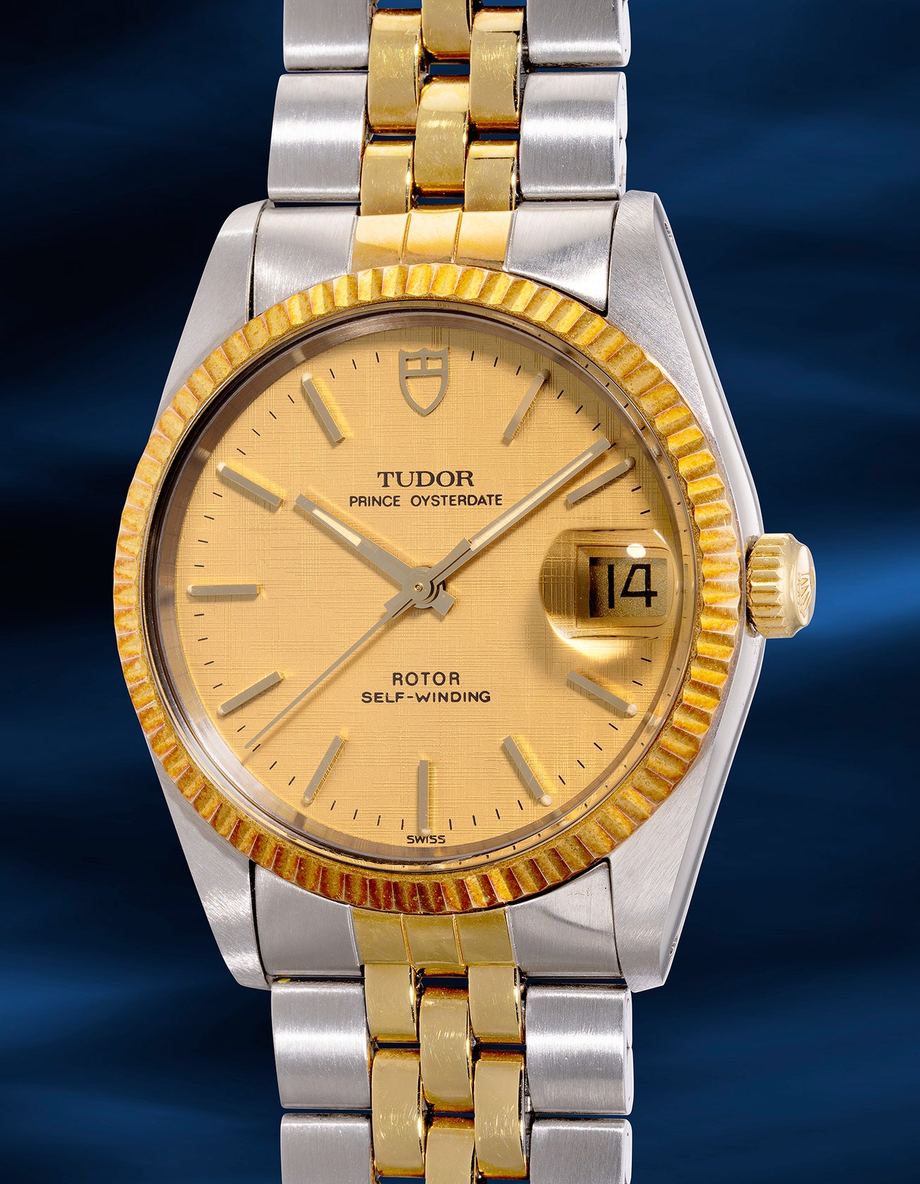 - The present Tudor Oyster Prince timepiece is a perfect representation of the collection's design in the 1980s. It features the classic two-tone case and bracelet, while the linen-textured dial adds an extra layer of depth and visual interest. The champagne-colored tone of the dial complements the case beautifully.