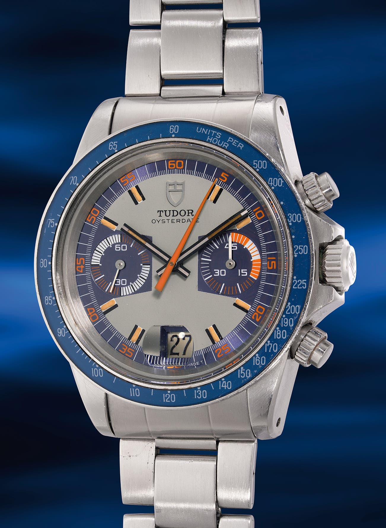 The present example, offered in excellent condition, showcases the grey and blue dial variant, accented with white and orange details that lend a lively and distinctive character to the watch. The playful contrast of colours, combined with the dial’s unique layout, is widely believed to be the inspiration behind its nickname “Monte Carlo,” as the design loosely evokes the appearance of a roulette wheel.