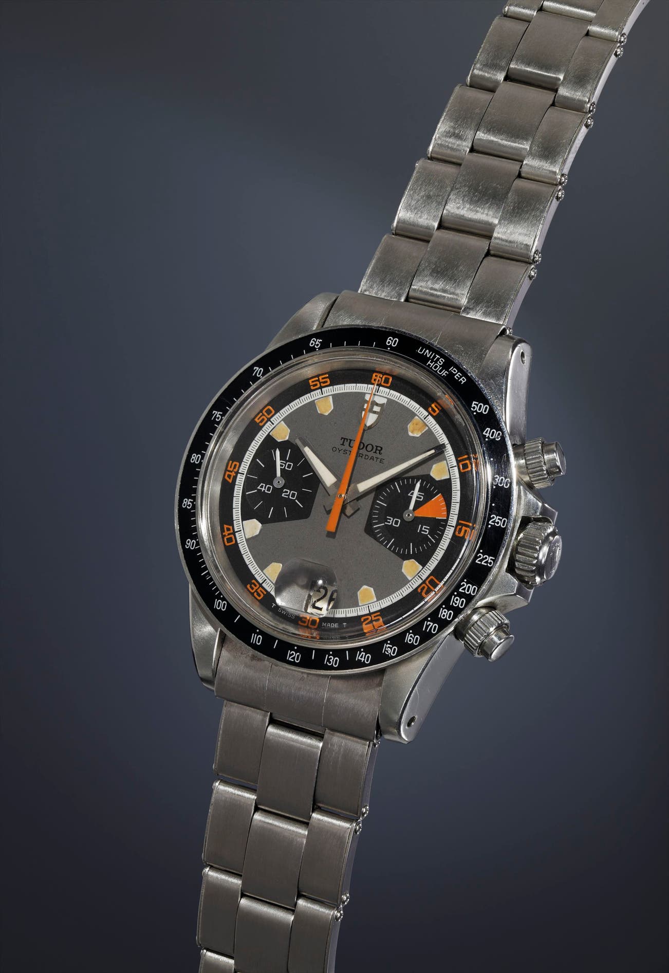 This stainless steel reference is fitted with a stunning matte grey dial with orange accents throughout. Amongst collectors, it is referred to as the “Monte Carlo,” or the “Home Plate” due to its dial design resembling a home plate in baseball. These gorgeous chronographs are amongst the most sought after of all Tudor watches. It’s completed by the original stainless steel riveted Oyster bracelet, perfectly complementing the dial’s sporty aesthetic.