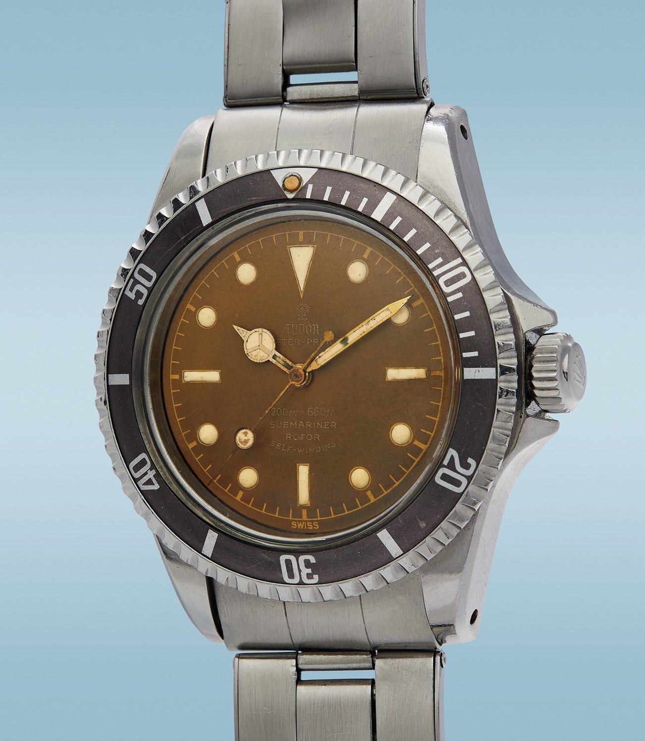 A stunning and extremely rare stainless steel diver’s wristwatch with lacquer gilt “tropical” dial, pointed crown guards, and bracelet