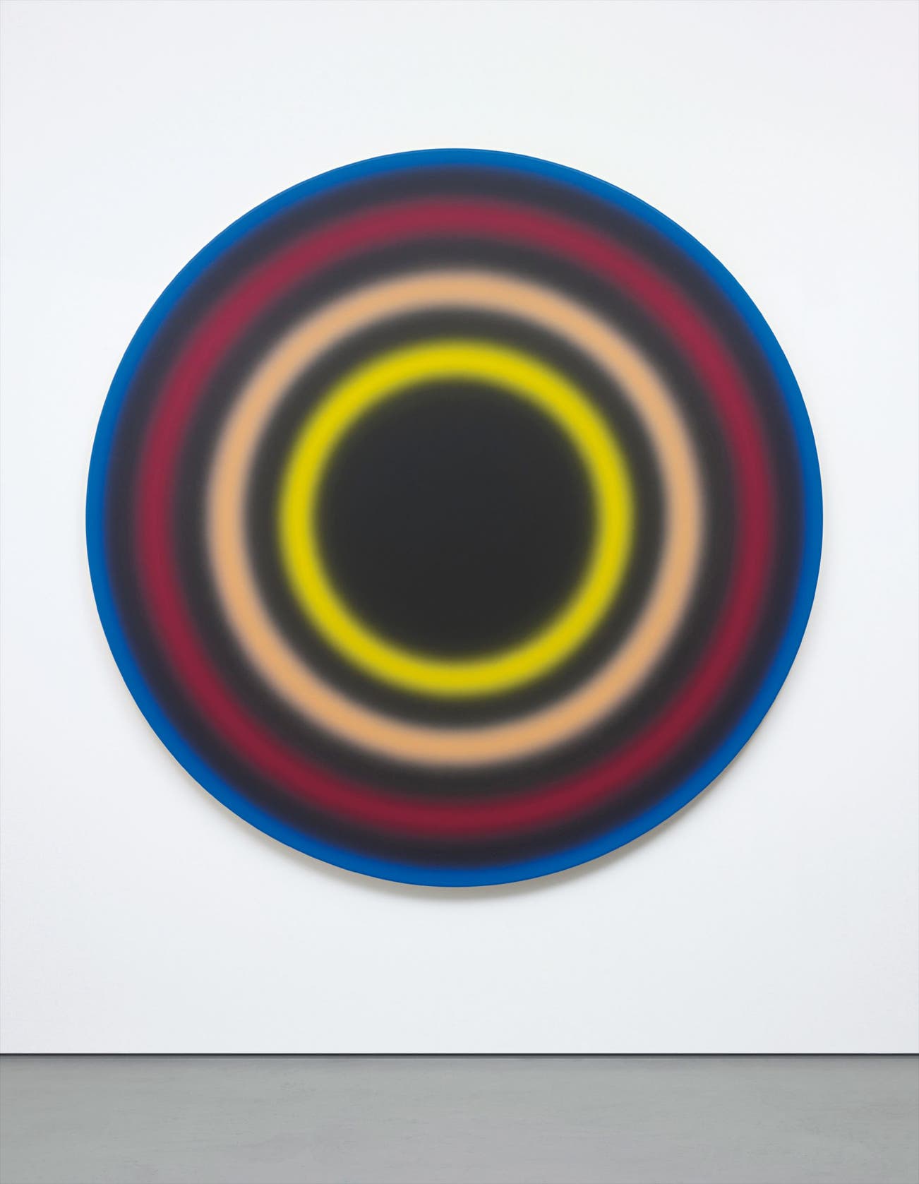 Ugo Rondinone’s ACHTERFEBRUARZWEITAUSENDUNDSIEBEN (February 8, 2007) from 2007, is a mesmerizing example from the series of target paintings that the Swiss-born artist has been making since the mid-nineties. While reminiscent of the work of the American Color Field painter Kenneth Noland and the target paintings of Jasper Johns, Rondinone’s circular, flat, vibrantly colored out-of-focus paintings have a contemporary aesthetic. These target paintings create a powerful visual experience – the viewer’s gaze is drawn hypnotically into the depths of the painting by the concentric circular bands of glowing color. By appropriating these key works of his predecessors, Rondinone’s work contains a subtle irony directed at modernism. Although the target is closely linked with the acts of looking and aiming, the concentric circles of his version are blurred, annihilating the essence of a target. Any Abstract Expressionist spirituality to be perceived in the work is banished by the banality of the work’s title which, as with every painting in this series, simply refers to the date of its creation – in the case of this work, February 8, 2007. The artist’s intention is to enthrall the viewer at first sight by simultaneously questioning our engagement with art in a very pure way. The monumental pictorial quality accelerates our desire towards the mystical work of art and invites us to dive into its sphere of new reality. The magical sphere is romantic in a naïve way, allowing the idea of a dream to take over the everyday.