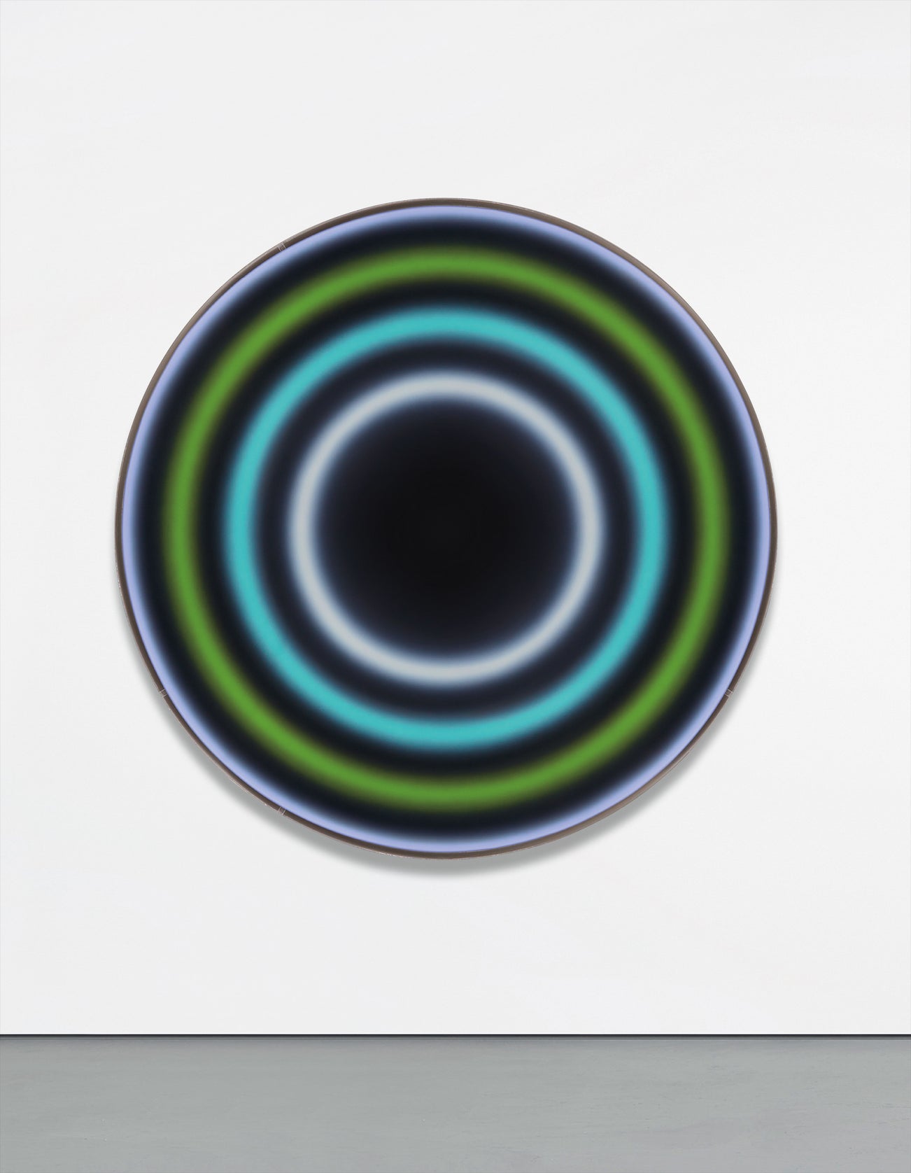 Among his multi-faceted production, which spans across various media including painting, sculpture, photography and video, the present lot is a mesmerising example from one of the artist’s most iconic Target Paintings series, which the artist has produced since the mid-nineties. Executed on a circular canvas, this work displays hazy rings of lime greens, whites, blues, and blacks that pulse in and out of the centre of the composition, creating a visual illusion that makes maintaining visual focus deliberately difficult. Favouring spray paint as a medium, Rondinone imposes an experiential intensity that arises from the hypnotic and abstract atmosphere in Mrz 2007, enthralling the viewer at first sight.